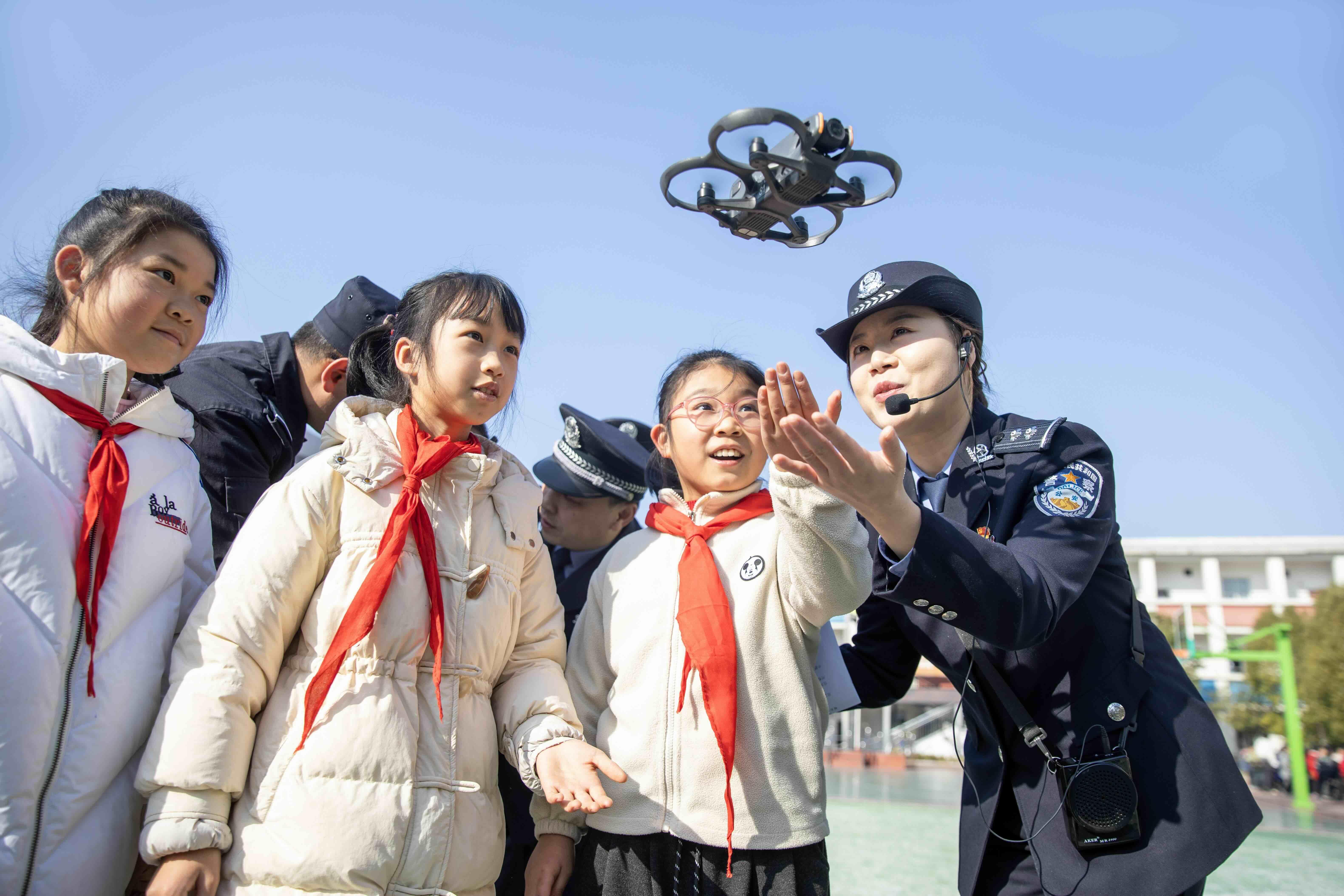 圖為民警向?qū)W生們講解警用無人機(jī)知識(shí)。