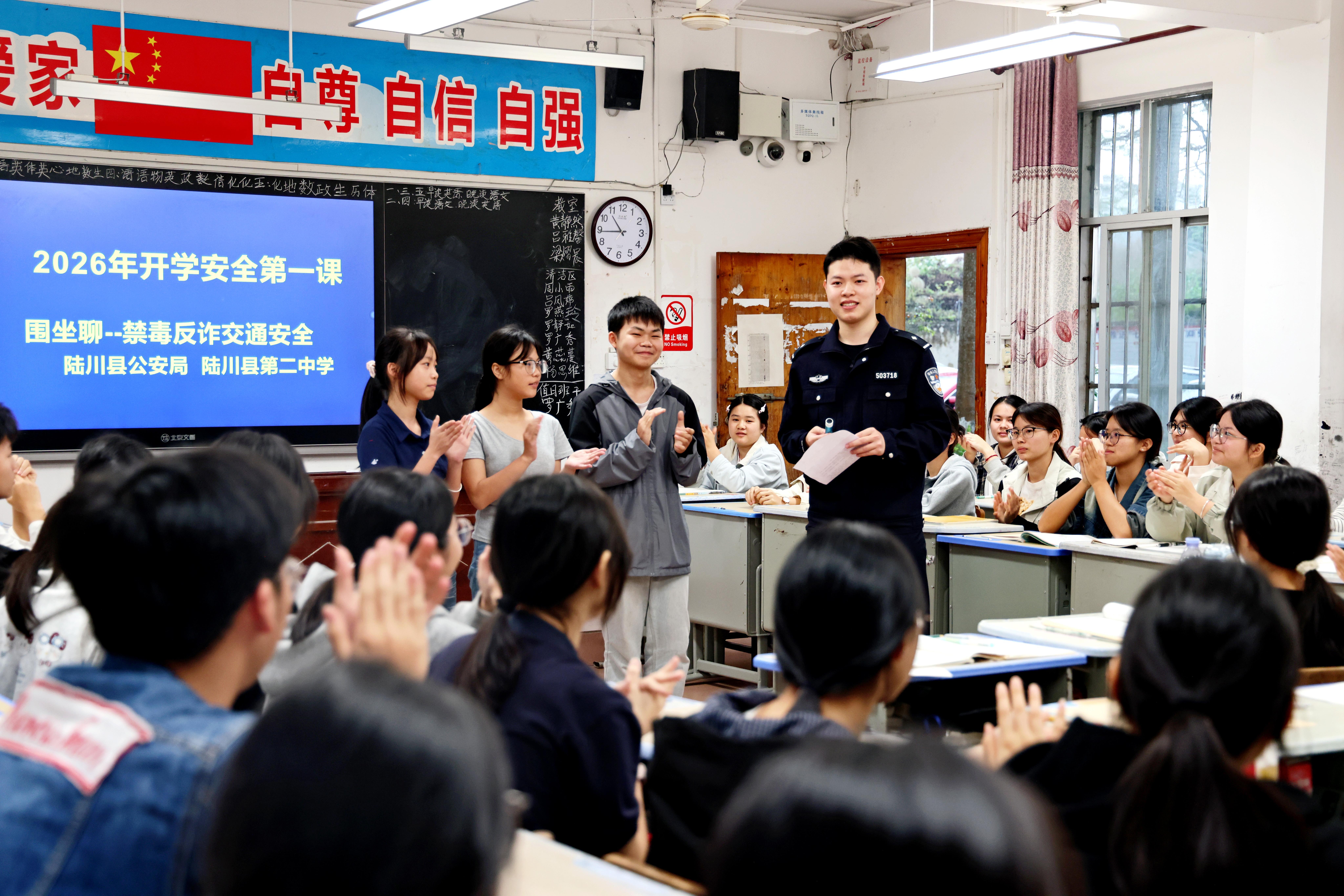 3月2日,春季開學(xué)首日,廣西壯族自治區(qū)玉林市陸川縣公安局走進(jìn)轄區(qū)學(xué)校,通過(guò)案例講解、互動(dòng)問(wèn)答等形式,向?qū)W生們普及禁毒、反詐及交通安全知識(shí),為新學(xué)期校園安全筑牢防線。