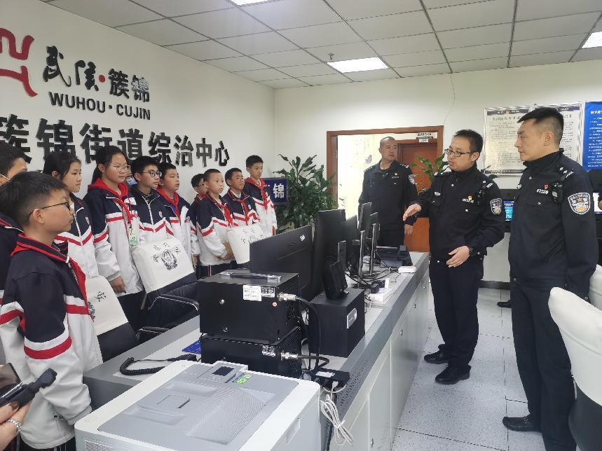 在派出所綜合指揮室,民警向同學(xué)們介紹日常工作運(yùn)行情況。當(dāng)同學(xué)們了解到,除了每天有警察巡邏守護(hù)外,“天網(wǎng)”也24小時(shí)關(guān)注和守護(hù)著校園的安全,紛紛向民警表達(dá)了感謝。