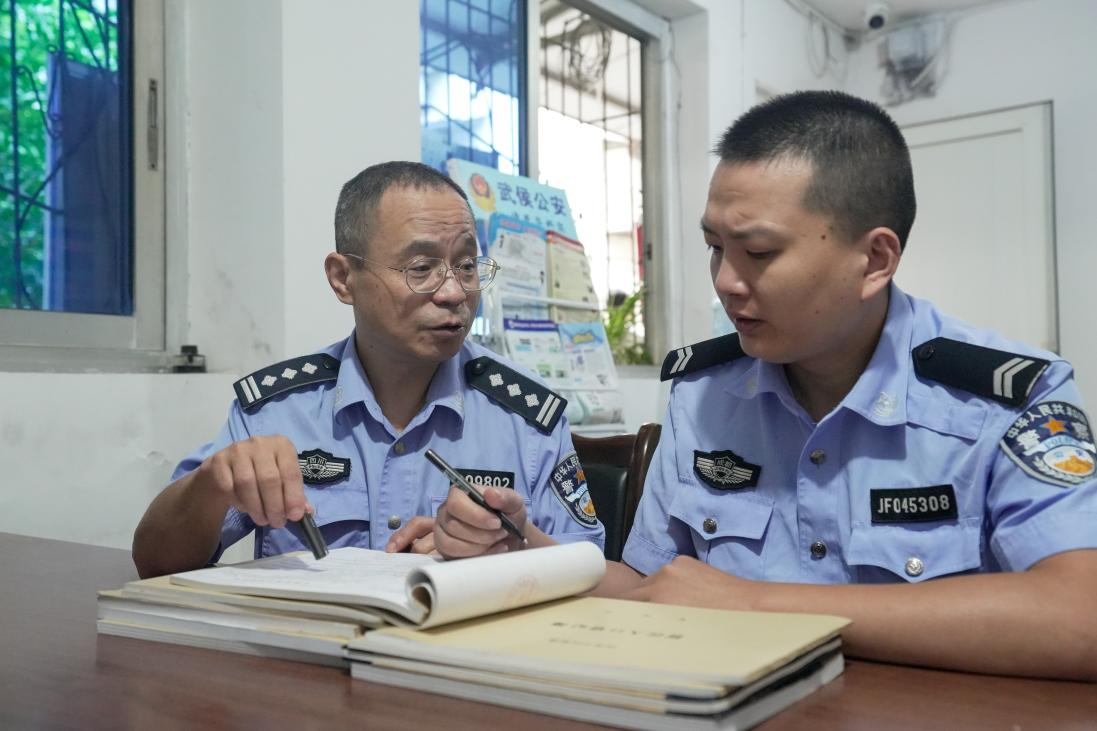 10月1日早會(huì)完畢,老葛就和徒弟萬(wàn)訊開(kāi)始“盤(pán)貨”,從臺(tái)賬到筆錄,一個(gè)“拎重點(diǎn)”、一個(gè)“記筆記”。“做社區(qū)民警,沒(méi)別的,就是勤快點(diǎn)、仔細(xì)點(diǎn),轄區(qū)里的人口、出租房、單位,每日的警情,什么時(shí)候你不看本子不看電腦,隨時(shí)隨地都能說(shuō)出來(lái),你就真的出師了......”老葛一邊給萬(wàn)訊交代著,一邊跨上了他的電瓶車(chē),風(fēng)風(fēng)火火地趕往棕南社區(qū),開(kāi)展節(jié)日期間消防安全防范宣傳。