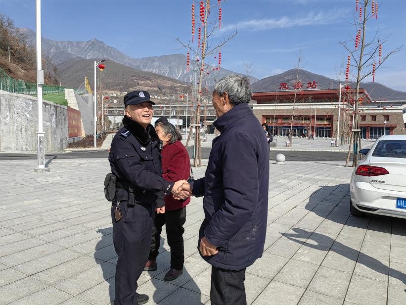 這樣的場景,在高鐵通車后屢見不鮮。為了確保站前以及周邊安全,茂縣公安成立了茂縣公安局富順派出所鐵路警務(wù)工作室,聯(lián)合特巡警開展站前巡邏、秩序維護(hù)以及巡線安全?!霸诂F(xiàn)有人員的基礎(chǔ)上,春節(jié)期間,我們派出所會隨時根據(jù)情況增派人手,保護(hù)群眾以及旅客的出行安全?!备豁樑沙鏊L趙全東說道。