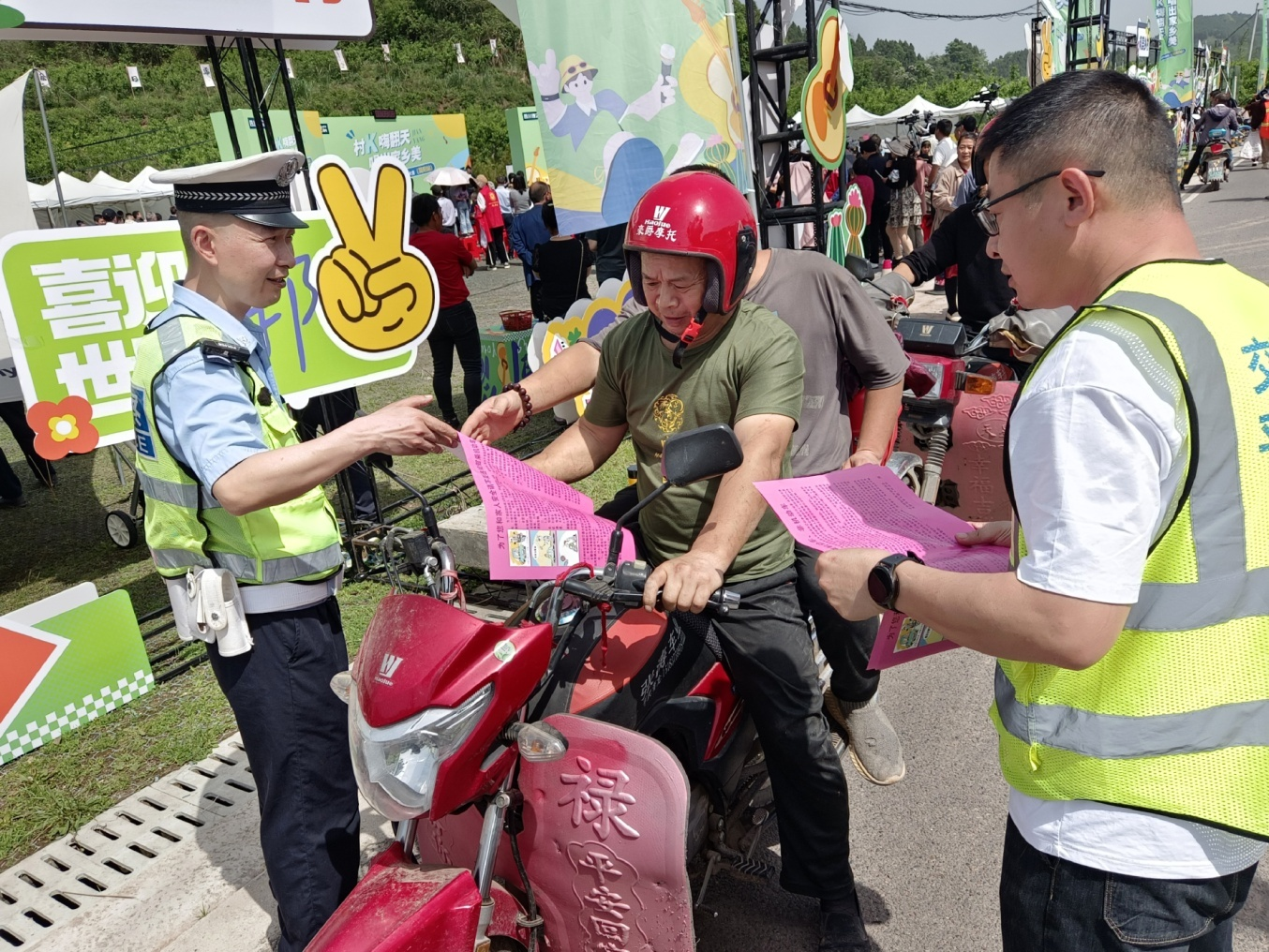 活動現(xiàn)場,公安交警、交管員和勸導(dǎo)員通過現(xiàn)場“喊麥”、發(fā)放宣傳資料、面對面宣講等形式,向過往群眾發(fā)送了《文明交通安全出行》《拒絕酒駕平安出行》《一盔一帶安全常在》等宣傳資料,用簡潔、通俗易懂的“方言土話”講解了常見的農(nóng)村道路交通違法行為,提醒村民不要酒后駕車,不能駕駛超員、超載、超速、無牌無證車輛上道路行駛,教育他們自覺摒棄交通陋習(xí),提高自身交通安全意識。警示前來參加K歌活動的群眾在返程及以后出行時拒絕乘坐超員車、農(nóng)用三輪車、無牌無證車等違法車輛。在活動臨時停車場,交管員勸導(dǎo)員用日常工作中的典型事故案例,向駕駛?cè)藛T解釋了“安全帶是生命帶,安全頭盔是生命頭盔”的意義。