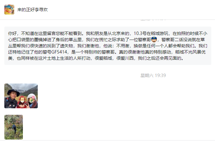 “你好,不知道在這里留言您能不能看到。我和朋友是從北京來的,10月3號日在稻城游玩,在拍照的時(shí)候不小心把口袋里的墨鏡掉進(jìn)了身后的草叢里,我們在慌忙之際求助了一位警察哥,警察哥二話沒說就在草叢里幫我們很快速的找到了遺失物,我們謝謝他,他說:不用謝,換做是任何一個(gè)人都會(huì)幫助我們。我們還特地記住了他的警號GF5414,是一個(gè)特別帥的警察哥。真的很謝謝他真的特別感動(dòng),稻城不光風(fēng)景優(yōu)美,也同樣被在這片土地上生活的人所打動(dòng),很愛稻城,很愛川西,我們之后還會(huì)再見面的?!?/p>