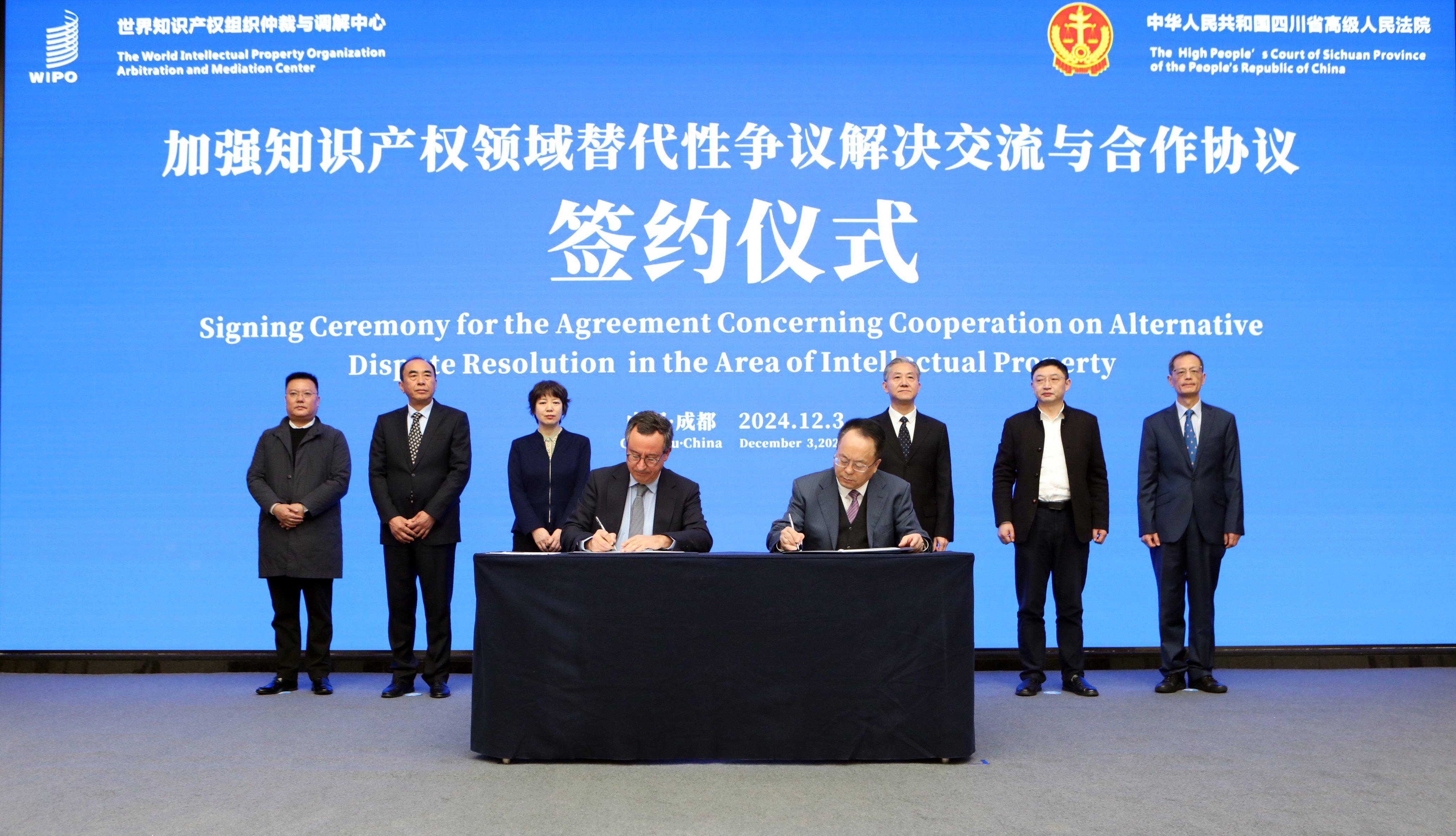 12月3日,四川高院黨組書記、院長王樹江與世界知識產(chǎn)權組織仲裁與調解中心司長伊格納西奧·德·卡斯特羅正式簽署《加強知識產(chǎn)權領域替代性爭議解決交流與合作協(xié)議》,這是四川高院為企業(yè)提供更加高效、便捷的糾紛化解機制的重要舉措。基于此,在最高人民法院的支持下,四川高院與世界知識產(chǎn)權組織仲裁與調解中心進行了近一年的磋商,最終成功簽署合作協(xié)議。