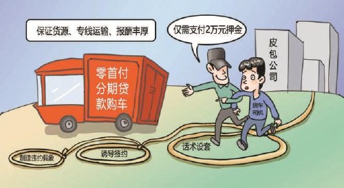 “我看公司挺正規(guī)的,這個(gè)經(jīng)理也很專業(yè),最關(guān)鍵的是,這個(gè)工資待遇算是很高的了,所以我立即就簽了合同?!毙》痘貞浾f。簽約后,根據(jù)公司要求,小范先交納了一大筆押金。原來,想要賺這份“高薪”,首先要根據(jù)簽約年限交給公司一筆1萬元至2萬元不等的押金。由于小范沒有自己的貨車,張經(jīng)理便要求他交納2萬元的押金,隨后幫他聯(lián)系4S店零首付分期貸款購買車輛,并承諾小范“如果以后不再跑物流,隨時(shí)可以把車子過戶到公司名下,不再還貸”。