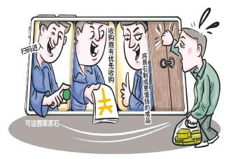 交易完成后,圈套進一步縮緊:主播會安排由“托兒”假扮的收購商向購買者加價收購,獲取信任,待其嘗到甜頭追加高額投入后,主播便會以“翡翠原石系盜竊所得”“翡翠原石被緬甸軍方查扣”等借口,引誘購買者委托其將所購翡翠原石制成成品。經(jīng)調(diào)查,這些成品系主播團隊以10元至百元不等的價格自攤販處收購,盡管它們含有翡翠元素,卻是價值極低的邊角料、廢料。