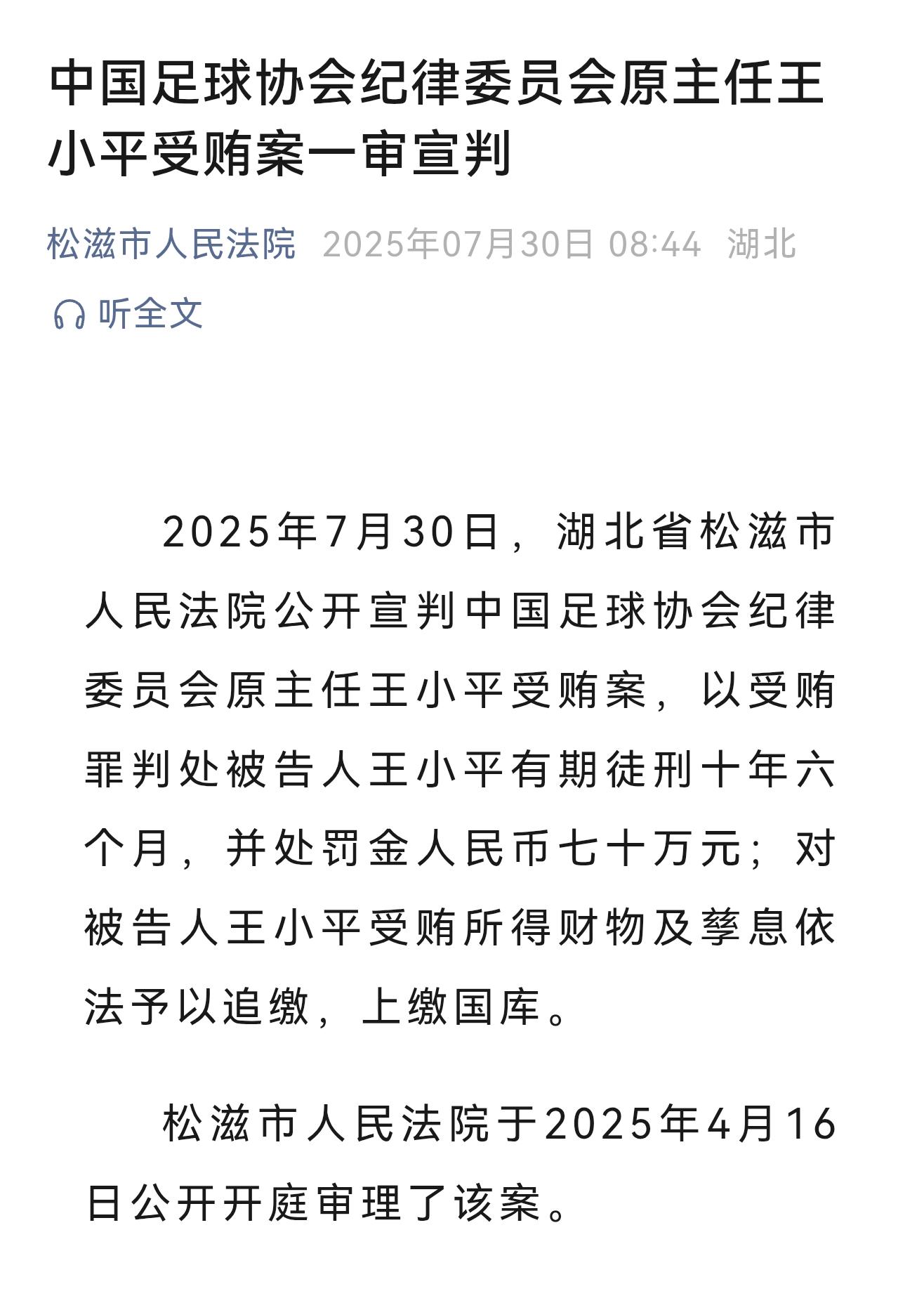 7月30日上午,湖北省荊州市松滋市人民法院、咸寧市通山縣人民法院分別對(duì)中國(guó)足球協(xié)會(huì)紀(jì)律委員會(huì)原主任王小平受賄案及中超聯(lián)賽有限責(zé)任公司原董事長(zhǎng)劉軍受賄、非國(guó)家工作人員受賄案進(jìn)行公開(kāi)宣判。