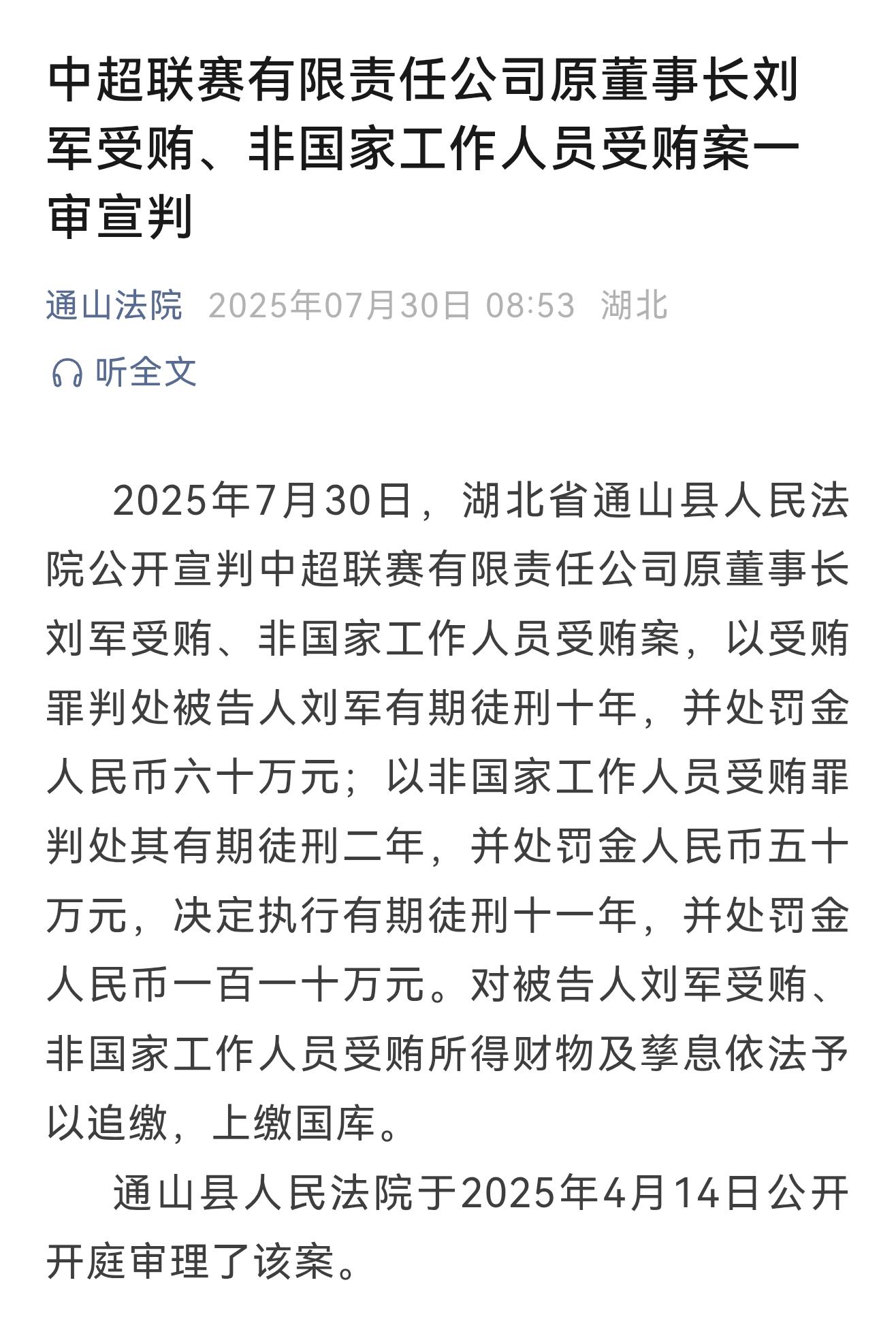 通山縣人民法院以受賄罪判處被告人劉軍有期徒刑十年,并處罰金人民幣六十萬(wàn)元;以非國(guó)家工作人員受賄罪判處其有期徒刑二年,并處罰金人民幣五十萬(wàn)元,決定執(zhí)行有期徒刑十一年,并處罰金人民幣一百一十萬(wàn)元。對(duì)被告人劉軍受賄、非國(guó)家工作人員受賄所得財(cái)物及孳息依法予以追繳,上繳國(guó)庫(kù)。通山縣法院于2025年4月14日公開(kāi)開(kāi)庭審理了該案。