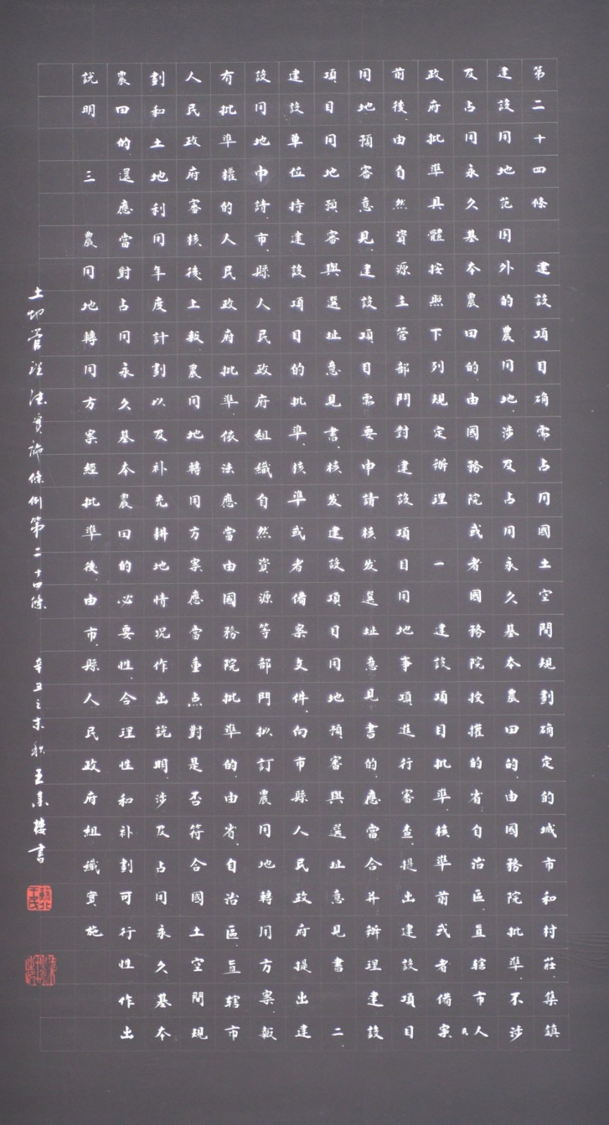 繼1600余位書法家參與書寫《中華人民共和國民法典》全部1260條法條之后,法治日報社聯(lián)合自然資源部法規(guī)司、自然資源部書畫研究會和北京昌平書法家協(xié)會,將筆端對準(zhǔn)土地管理“一法一條例”,即《中華人民共和國土地管理法》和《中華人民共和國土地管理法實(shí)施條例》。