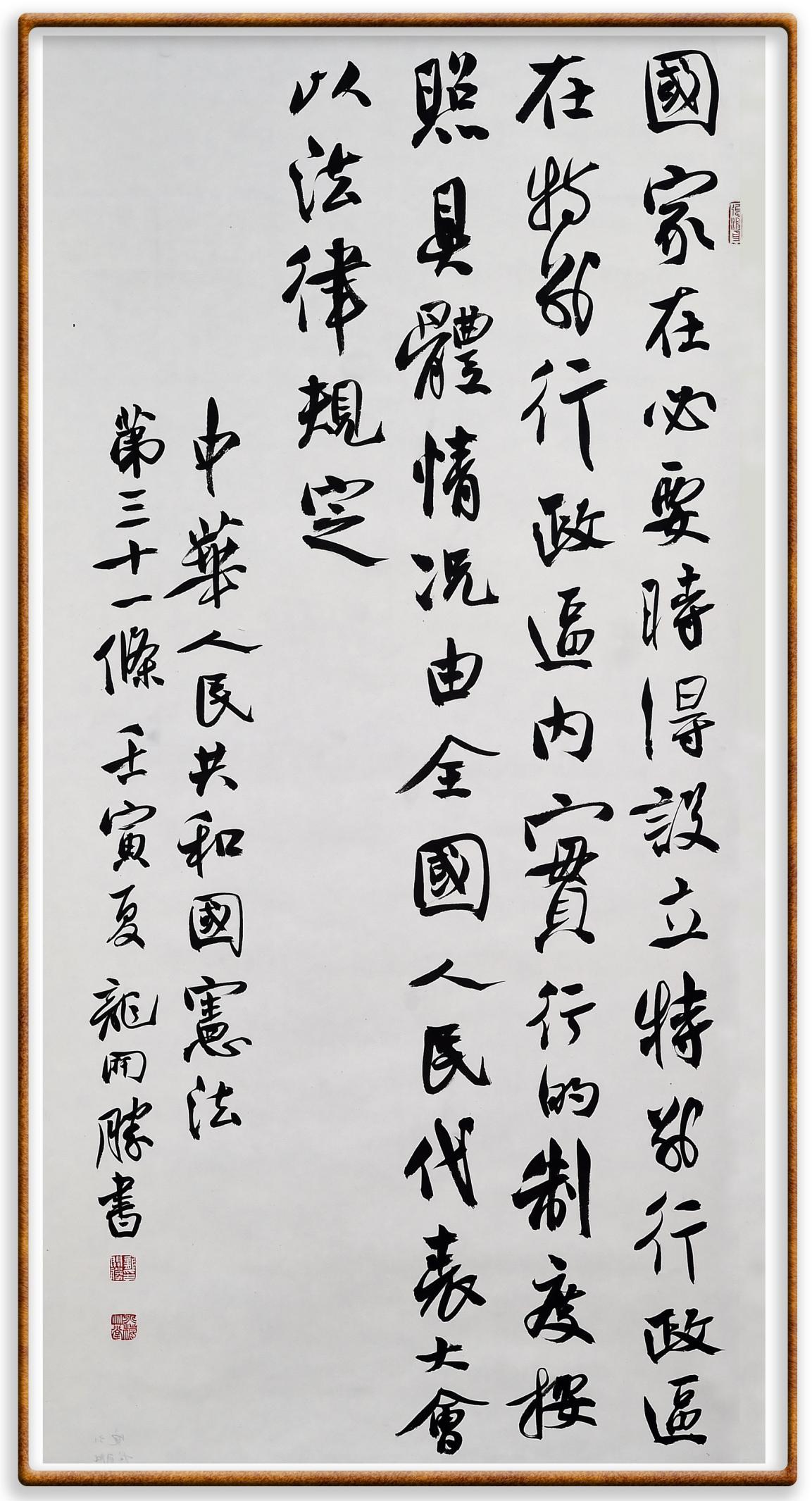 繼《中華人民共和國民法典》《中華人民共和國土地管理法》《中華人民共和國土地管理法實施條例》《中華人民共和國法律援助法》之后,法治日報社聯(lián)合北京市司法局、北京市書法家協(xié)會,將筆端對準(zhǔn)《中華人民共和國憲法》和《中華人民共和國行政處罰法》。