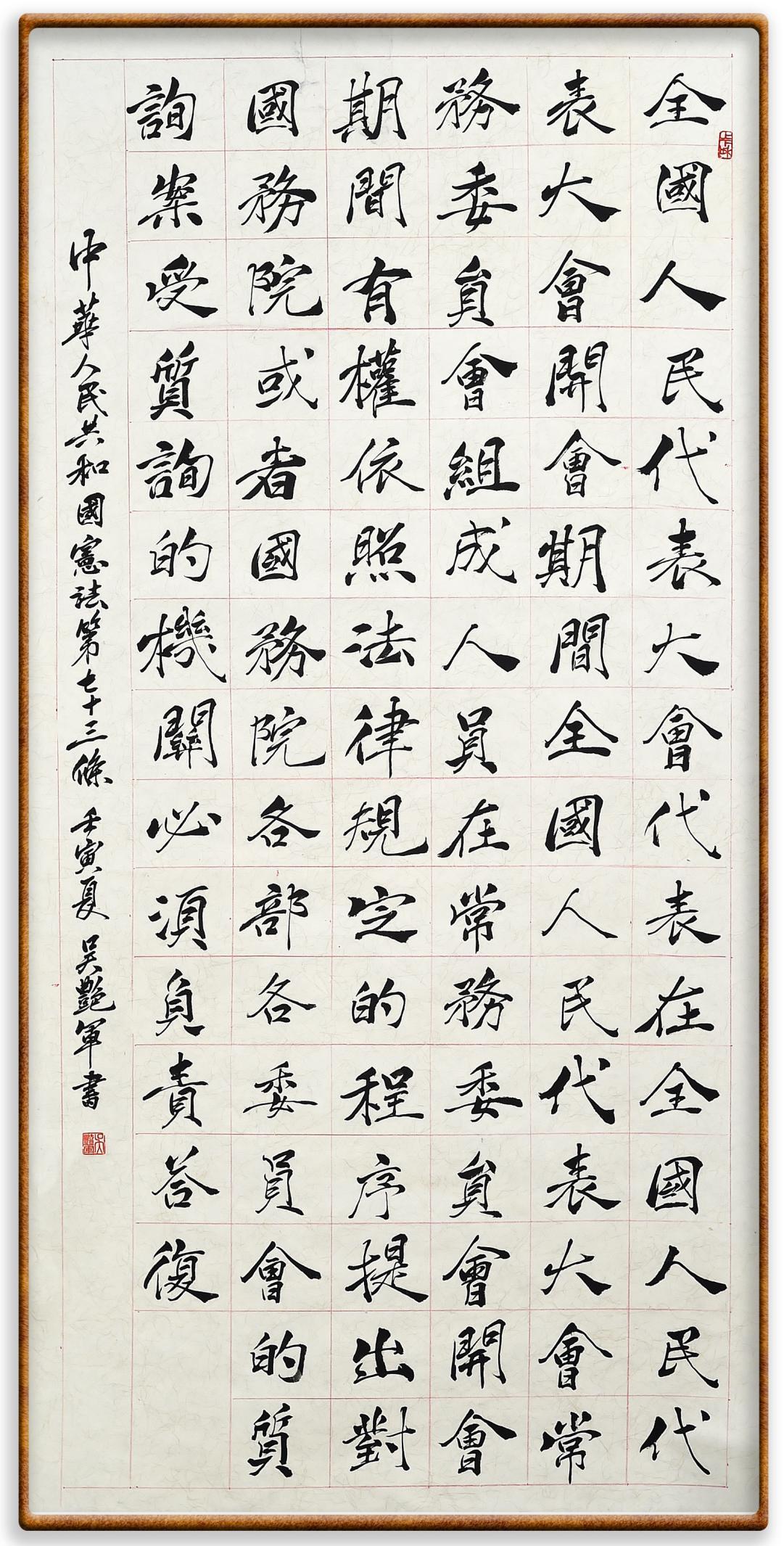 繼《中華人民共和國民法典》《中華人民共和國土地管理法》《中華人民共和國土地管理法實(shí)施條例》《中華人民共和國法律援助法》之后,法治日?qǐng)?bào)社聯(lián)合北京市司法局、北京書法家協(xié)會(huì),將筆端對(duì)準(zhǔn)《中華人民共和國憲法》和《中華人民共和國行政處罰法》。