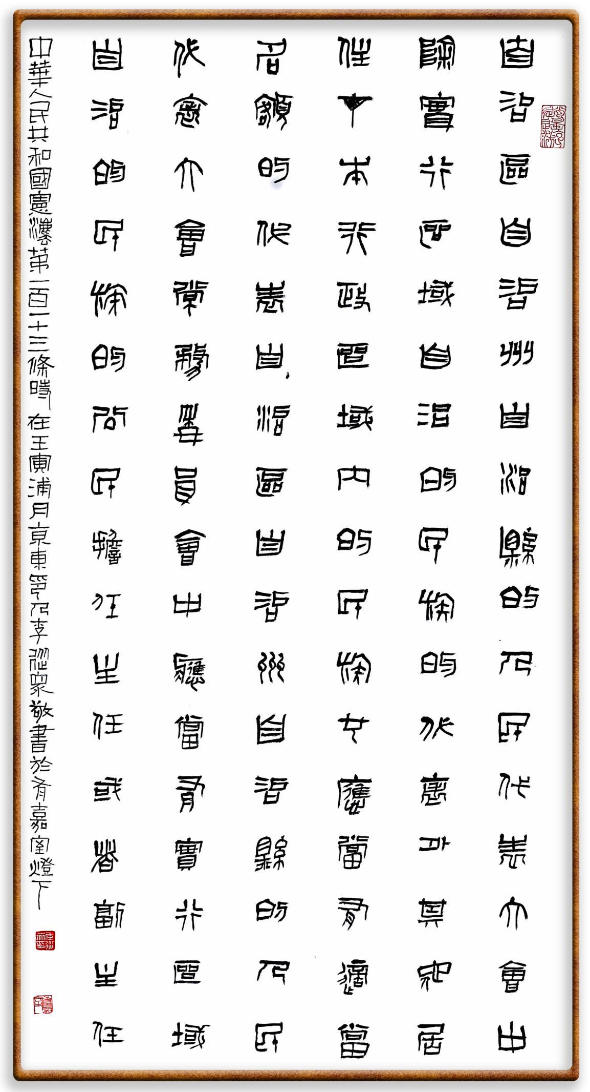繼《中華人民共和國(guó)民法典》《中華人民共和國(guó)土地管理法》《中華人民共和國(guó)土地管理法實(shí)施條例》《中華人民共和國(guó)法律援助法》之后,法治日?qǐng)?bào)社聯(lián)合北京市司法局、北京書(shū)法家協(xié)會(huì),將筆端對(duì)準(zhǔn)《中華人民共和國(guó)憲法》和《中華人民共和國(guó)行政處罰法》。