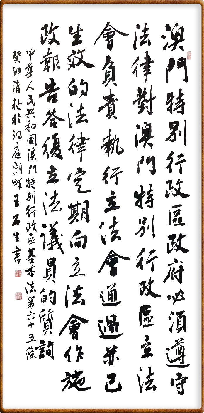 澳門基本法第六十五條 澳門特別行政區(qū)政府必須遵守法律,對(duì)澳門特別行政區(qū)立法會(huì)負(fù)責(zé):執(zhí)行立法會(huì)通過并已生效的法律;定期向立法會(huì)作施政報(bào)告;答復(fù)立法會(huì)議員的質(zhì)詢。