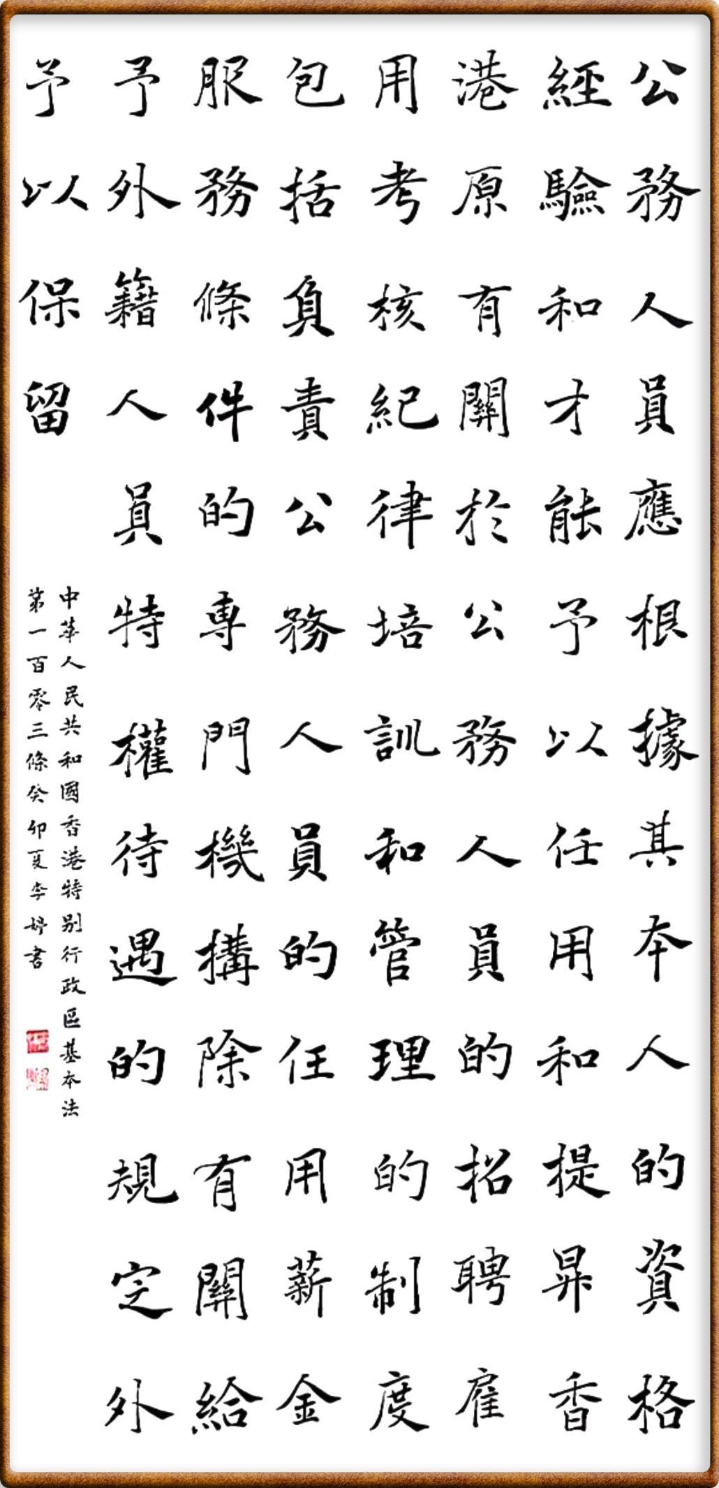 香港基本法第一百零三條 公務(wù)人員應(yīng)根據(jù)其本人的資格、經(jīng)驗(yàn)和才能予以任用和提升,香港原有關(guān)于公務(wù)人員的招聘、雇用、考核、紀(jì)律、培訓(xùn)和管理的制度,包括負(fù)責(zé)公務(wù)人員的任用、薪金、服務(wù)條件的專(zhuān)門(mén)機(jī)構(gòu),除有關(guān)給予外籍人員特權(quán)待遇的規(guī)定外,予以保留。