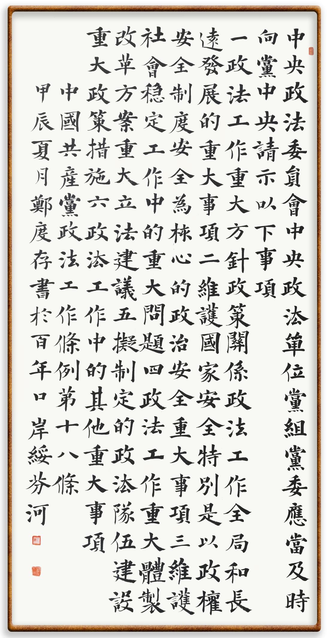 《中國(guó)共產(chǎn)黨政法工作條例》對(duì)黨領(lǐng)導(dǎo)新時(shí)代政法工作進(jìn)行全面制度擘畫(huà),為黨領(lǐng)導(dǎo)政法工作提供基本遵循,具有重大而深遠(yuǎn)的意義。為學(xué)習(xí)好、宣傳好、貫徹好、實(shí)施好這部黨內(nèi)法規(guī),繼《中華人民共和國(guó)民法典》《中華人民共和國(guó)憲法》《信訪工作條例》《中華人民共和國(guó)澳門特別行政區(qū)基本法》《中華人民共和國(guó)香港特別行政區(qū)基本法》等法律法規(guī)之后,“書(shū)·法”系列活動(dòng)將筆端對(duì)準(zhǔn)《中國(guó)共產(chǎn)黨政法工作條例》。