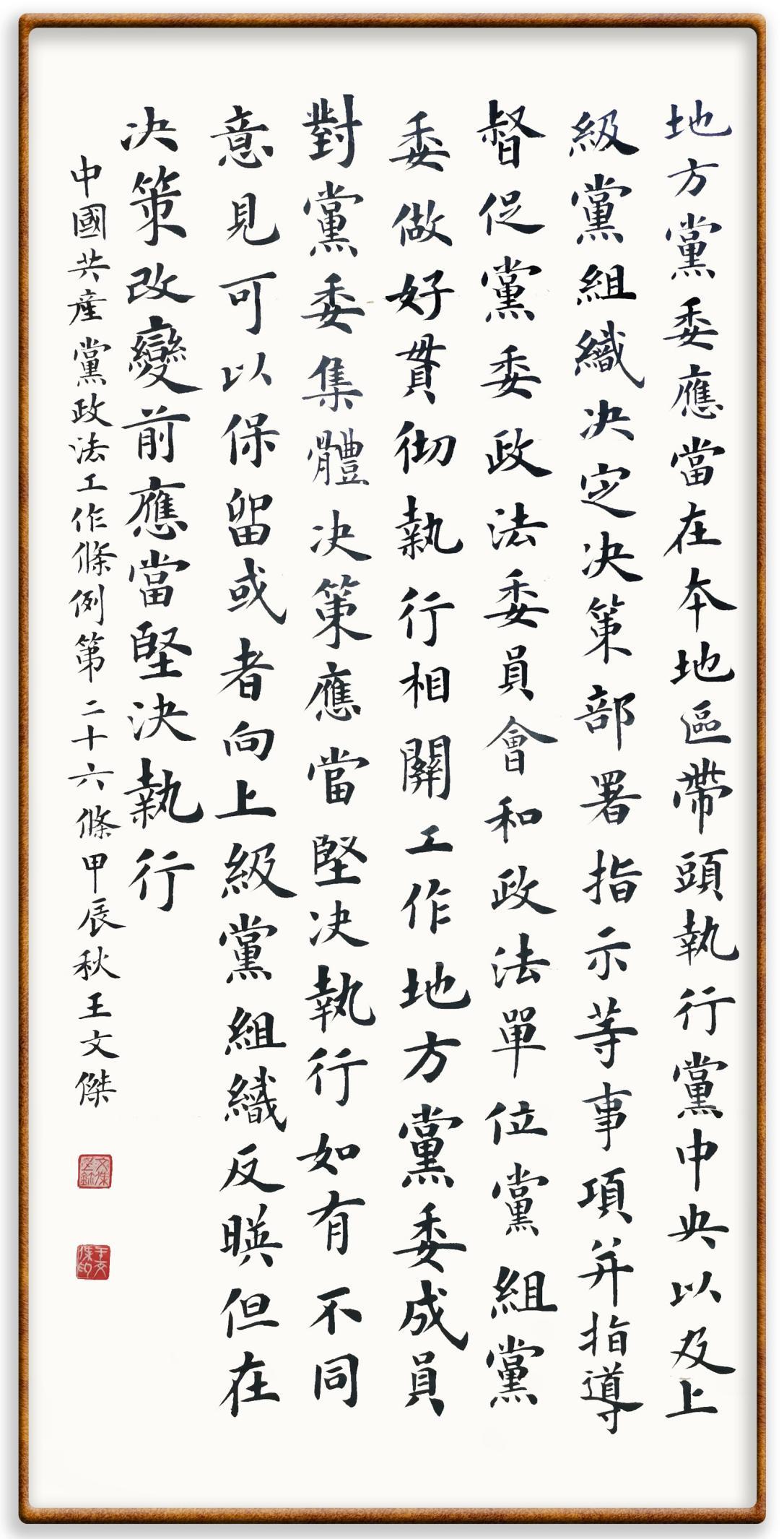 《中國共產(chǎn)黨政法工作條例》對黨領(lǐng)導(dǎo)新時代政法工作進(jìn)行全面制度擘畫,為黨領(lǐng)導(dǎo)政法工作提供基本遵循,具有重大而深遠(yuǎn)的意義。為學(xué)習(xí)好、宣傳好、貫徹好、實施好這部黨內(nèi)法規(guī),繼《中華人民共和國民法典》《中華人民共和國憲法》《信訪工作條例》《中華人民共和國澳門特別行政區(qū)基本法》《中華人民共和國香港特別行政區(qū)基本法》等法律法規(guī)之后,“書·法”系列活動將筆端對準(zhǔn)《中國共產(chǎn)黨政法工作條例》。