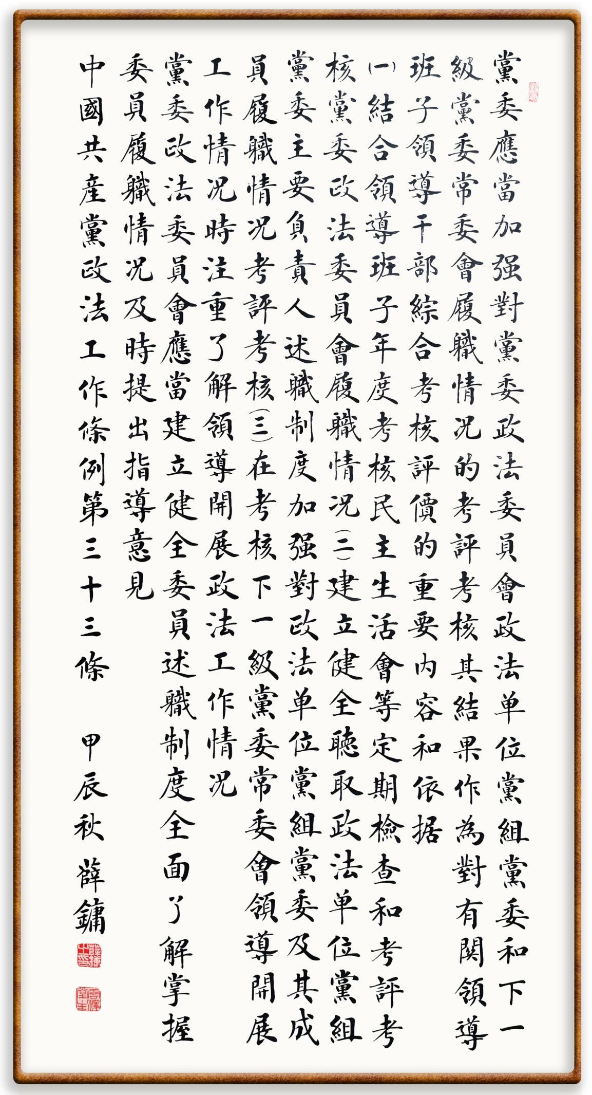 《中國(guó)共產(chǎn)黨政法工作條例》對(duì)黨領(lǐng)導(dǎo)新時(shí)代政法工作進(jìn)行全面制度擘畫,為黨領(lǐng)導(dǎo)政法工作提供基本遵循,具有重大而深遠(yuǎn)的意義。為學(xué)習(xí)好、宣傳好、貫徹好、實(shí)施好這部黨內(nèi)法規(guī),繼《中華人民共和國(guó)民法典》《中華人民共和國(guó)憲法》《信訪工作條例》《中華人民共和國(guó)澳門特別行政區(qū)基本法》《中華人民共和國(guó)香港特別行政區(qū)基本法》等法律法規(guī)之后,“書·法”系列活動(dòng)將筆端對(duì)準(zhǔn)《中國(guó)共產(chǎn)黨政法工作條例》。
