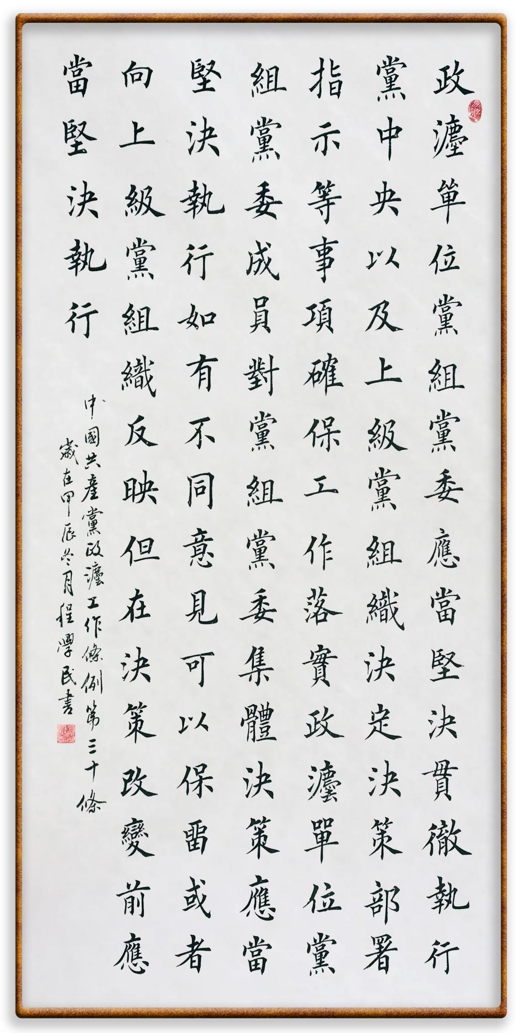 《中國(guó)共產(chǎn)黨政法工作條例》對(duì)黨領(lǐng)導(dǎo)新時(shí)代政法工作進(jìn)行全面制度擘畫,為黨領(lǐng)導(dǎo)政法工作提供基本遵循,具有重大而深遠(yuǎn)的意義。為學(xué)習(xí)好、宣傳好、貫徹好、實(shí)施好這部黨內(nèi)法規(guī),繼《中華人民共和國(guó)民法典》《中華人民共和國(guó)憲法》《信訪工作條例》《中華人民共和國(guó)澳門特別行政區(qū)基本法》《中華人民共和國(guó)香港特別行政區(qū)基本法》等法律法規(guī)之后,“書·法”系列活動(dòng)將筆端對(duì)準(zhǔn)《中國(guó)共產(chǎn)黨政法工作條例》。