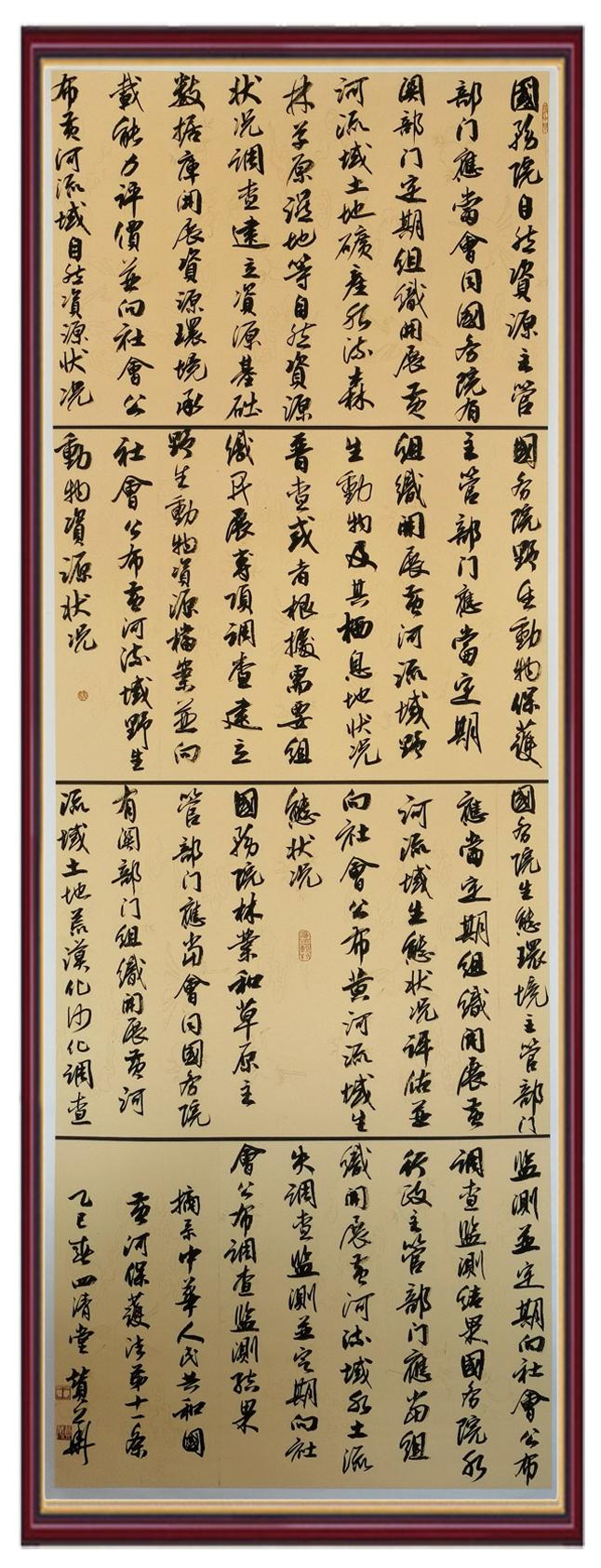 黃河寧,天下平。黃河是中華民族的發(fā)源地和搖籃,保護黃河是事關中華民族偉大復興的千秋大計?!吨腥A人民共和國黃河保護法》為推進水資源節(jié)約集約利用、保護傳承弘揚黃河文化、推動黃河流域生態(tài)保護和高質量發(fā)展提供了有力法治保障。繼書寫《中華人民共和國民法典》《中華人民共和國憲法》《中華人民共和國澳門特別行政區(qū)基本法》《中華人民共和國香港特別行政區(qū)基本法》《中華人民共和國國旗法》《中華人民共和國國徽法》《中華人民共和國國歌法》《中華人民共和國法官法》等法律法規(guī)之后,法制日報社聯(lián)合沿黃九?。▍^(qū))司法廳、書法家協(xié)會,將筆端對準《中華人民共和國黃河保護法》。