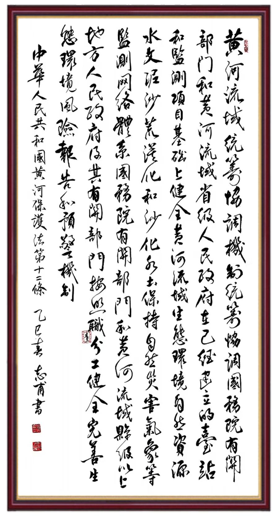 黃河寧,天下平。黃河是中華民族的發(fā)源地和搖籃,保護(hù)黃河是事關(guān)中華民族偉大復(fù)興的千秋大計(jì)。《中華人民共和國黃河保護(hù)法》為推進(jìn)水資源節(jié)約集約利用、保護(hù)傳承弘揚(yáng)黃河文化、推動(dòng)黃河流域生態(tài)保護(hù)和高質(zhì)量發(fā)展提供了有力法治保障。繼書寫《中華人民共和國民法典》《中華人民共和國憲法》《中華人民共和國澳門特別行政區(qū)基本法》《中華人民共和國香港特別行政區(qū)基本法》《中華人民共和國國旗法》《中華人民共和國國徽法》《中華人民共和國國歌法》《中華人民共和國法官法》等法律法規(guī)之后,法制日?qǐng)?bào)社聯(lián)合沿黃九?。▍^(qū))司法廳、書法家協(xié)會(huì),將筆端對(duì)準(zhǔn)《中華人民共和國黃河保護(hù)法》。