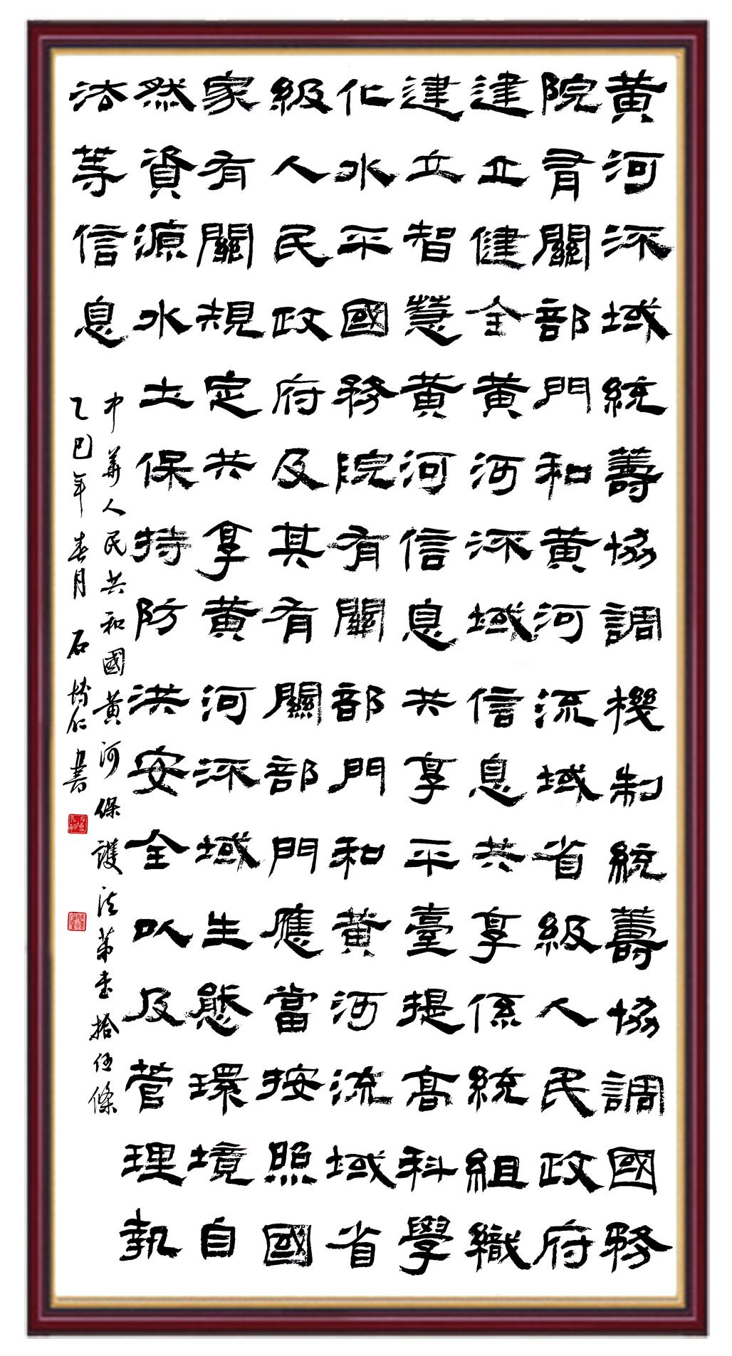 黃河寧,天下平。黃河是中華民族的發(fā)源地和搖籃,保護(hù)黃河是事關(guān)中華民族偉大復(fù)興的千秋大計(jì)?!吨腥A人民共和國(guó)黃河保護(hù)法》為推進(jìn)水資源節(jié)約集約利用、保護(hù)傳承弘揚(yáng)黃河文化、推動(dòng)黃河流域生態(tài)保護(hù)和高質(zhì)量發(fā)展提供了有力法治保障。繼書(shū)寫(xiě)《中華人民共和國(guó)民法典》《中華人民共和國(guó)憲法》《中華人民共和國(guó)澳門(mén)特別行政區(qū)基本法》《中華人民共和國(guó)香港特別行政區(qū)基本法》《中華人民共和國(guó)國(guó)旗法》《中華人民共和國(guó)國(guó)徽法》《中華人民共和國(guó)國(guó)歌法》《中華人民共和國(guó)法官法》等法律法規(guī)之后,法制日?qǐng)?bào)社聯(lián)合沿黃九?。▍^(qū))司法廳、書(shū)法家協(xié)會(huì),將筆端對(duì)準(zhǔn)《中華人民共和國(guó)黃河保護(hù)法》。