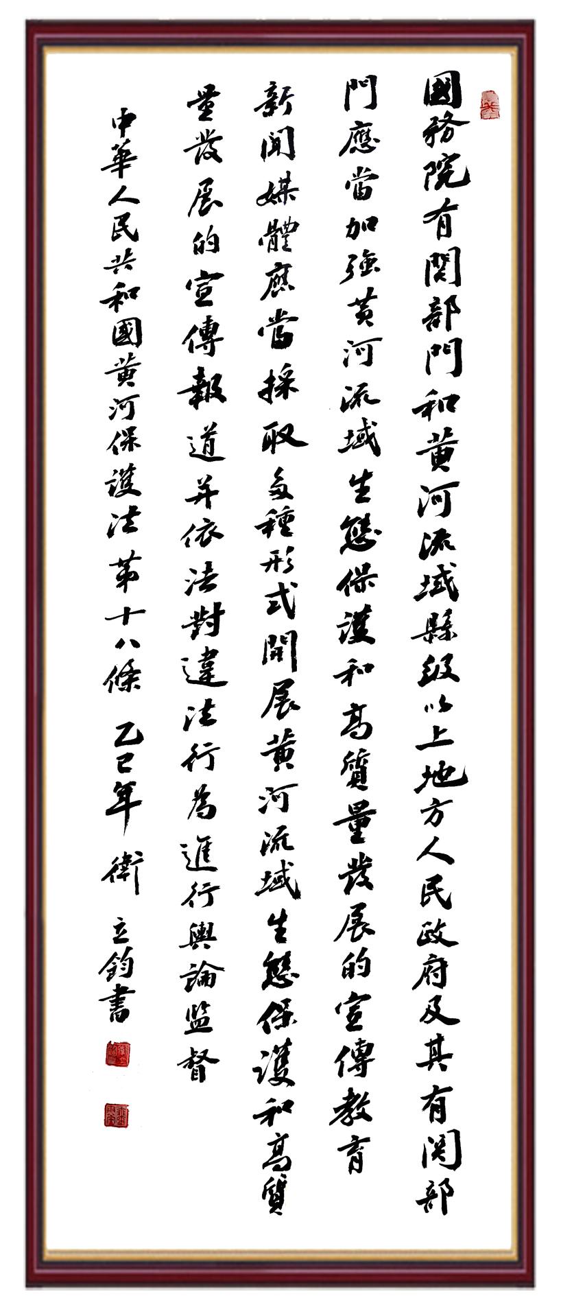 黃河寧,天下平。黃河是中華民族的發(fā)源地和搖籃,保護(hù)黃河是事關(guān)中華民族偉大復(fù)興的千秋大計。《中華人民共和國黃河保護(hù)法》為推進(jìn)水資源節(jié)約集約利用、保護(hù)傳承弘揚黃河文化、推動黃河流域生態(tài)保護(hù)和高質(zhì)量發(fā)展提供了有力法治保障。繼書寫《中華人民共和國民法典》《中華人民共和國憲法》《中華人民共和國澳門特別行政區(qū)基本法》《中華人民共和國香港特別行政區(qū)基本法》《中華人民共和國國旗法》《中華人民共和國國徽法》《中華人民共和國國歌法》《中華人民共和國法官法》等法律法規(guī)之后,法制日報社聯(lián)合沿黃九?。▍^(qū))司法廳、書法家協(xié)會,將筆端對準(zhǔn)《中華人民共和國黃河保護(hù)法》。