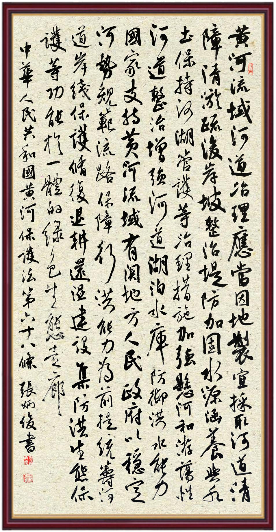 黃河寧,天下平。黃河是中華民族的發(fā)源地和搖籃,保護(hù)黃河是事關(guān)中華民族偉大復(fù)興的千秋大計(jì)?!吨腥A人民共和國黃河保護(hù)法》為推進(jìn)水資源節(jié)約集約利用、保護(hù)傳承弘揚(yáng)黃河文化、推動(dòng)黃河流域生態(tài)保護(hù)和高質(zhì)量發(fā)展提供了有力法治保障。繼書寫《中華人民共和國民法典》《中華人民共和國憲法》《中華人民共和國澳門特別行政區(qū)基本法》《中華人民共和國香港特別行政區(qū)基本法》《中華人民共和國國旗法》《中華人民共和國國徽法》《中華人民共和國國歌法》《中華人民共和國法官法》等法律法規(guī)之后,法制日?qǐng)?bào)社聯(lián)合沿黃九省(區(qū))司法廳、書法家協(xié)會(huì),將筆端對(duì)準(zhǔn)《中華人民共和國黃河保護(hù)法》。