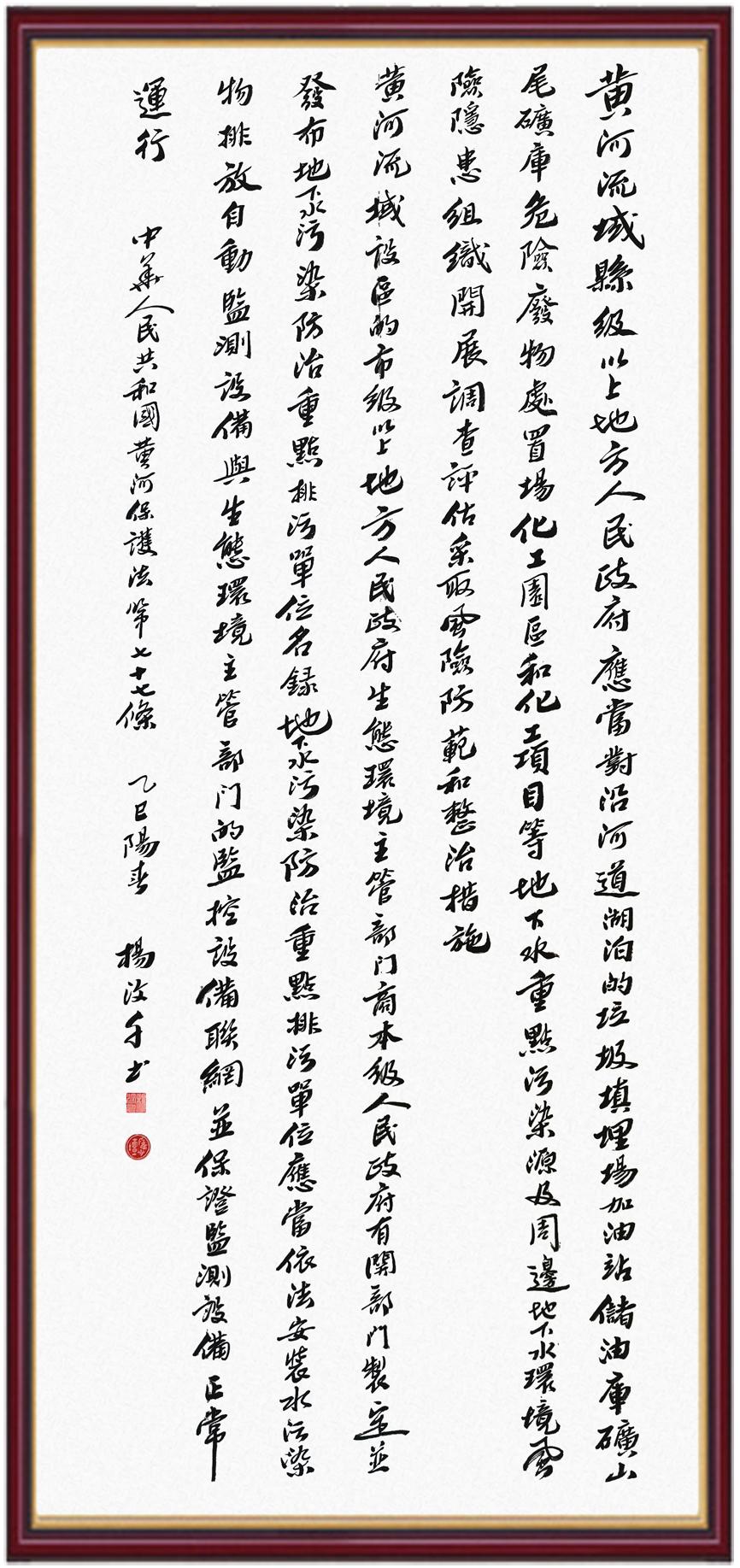 黃河寧,天下平。黃河是中華民族的發(fā)源地和搖籃,保護黃河是事關(guān)中華民族偉大復興的千秋大計?!吨腥A人民共和國黃河保護法》為推進水資源節(jié)約集約利用、保護傳承弘揚黃河文化、推動黃河流域生態(tài)保護和高質(zhì)量發(fā)展提供了有力法治保障。繼書寫《中華人民共和國民法典》《中華人民共和國憲法》《中華人民共和國澳門特別行政區(qū)基本法》《中華人民共和國香港特別行政區(qū)基本法》《中華人民共和國國旗法》《中華人民共和國國徽法》《中華人民共和國國歌法》《中華人民共和國法官法》等法律法規(guī)之后,法制日報社聯(lián)合沿黃九省(區(qū))司法廳、書法家協(xié)會,將筆端對準《中華人民共和國黃河保護法》。
