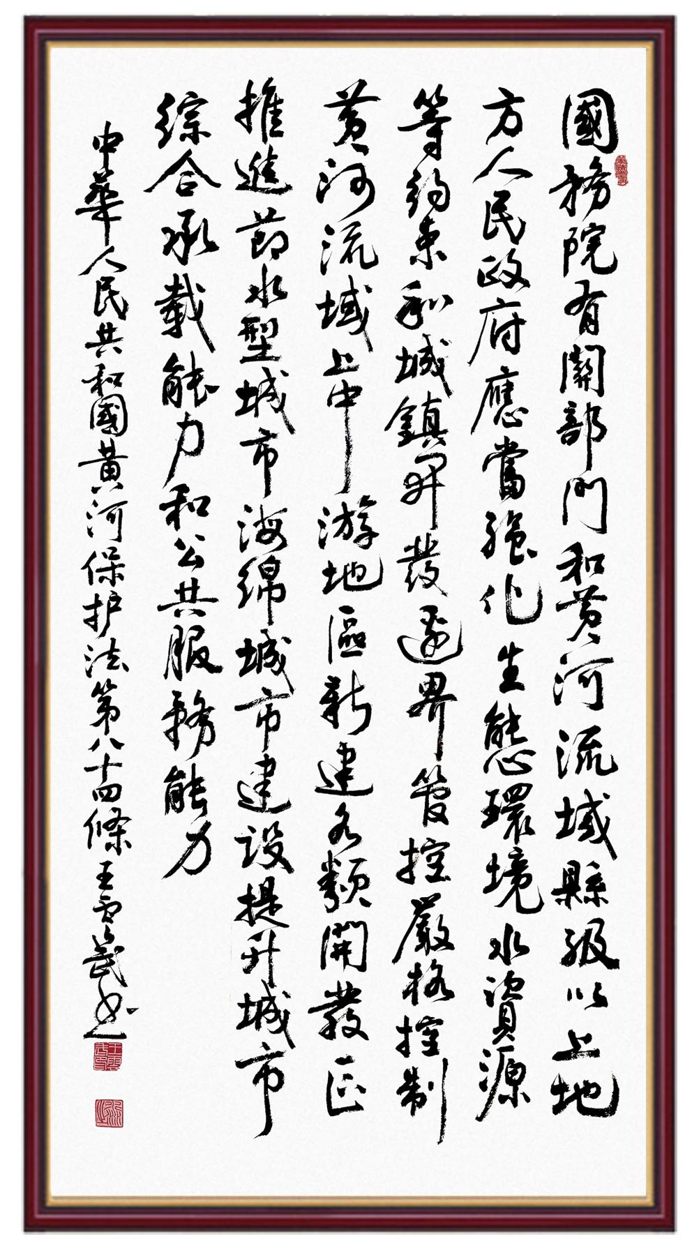 黃河寧,天下平。黃河是中華民族的發(fā)源地和搖籃,保護(hù)黃河是事關(guān)中華民族偉大復(fù)興的千秋大計(jì)?!吨腥A人民共和國(guó)黃河保護(hù)法》為推進(jìn)水資源節(jié)約集約利用、保護(hù)傳承弘揚(yáng)黃河文化、推動(dòng)黃河流域生態(tài)保護(hù)和高質(zhì)量發(fā)展提供了有力法治保障。繼書寫《中華人民共和國(guó)民法典》《中華人民共和國(guó)憲法》《中華人民共和國(guó)澳門特別行政區(qū)基本法》《中華人民共和國(guó)香港特別行政區(qū)基本法》《中華人民共和國(guó)國(guó)旗法》《中華人民共和國(guó)國(guó)徽法》《中華人民共和國(guó)國(guó)歌法》《中華人民共和國(guó)法官法》等法律法規(guī)之后,法制日?qǐng)?bào)社聯(lián)合沿黃九?。▍^(qū))司法廳、書法家協(xié)會(huì),將筆端對(duì)準(zhǔn)《中華人民共和國(guó)黃河保護(hù)法》。