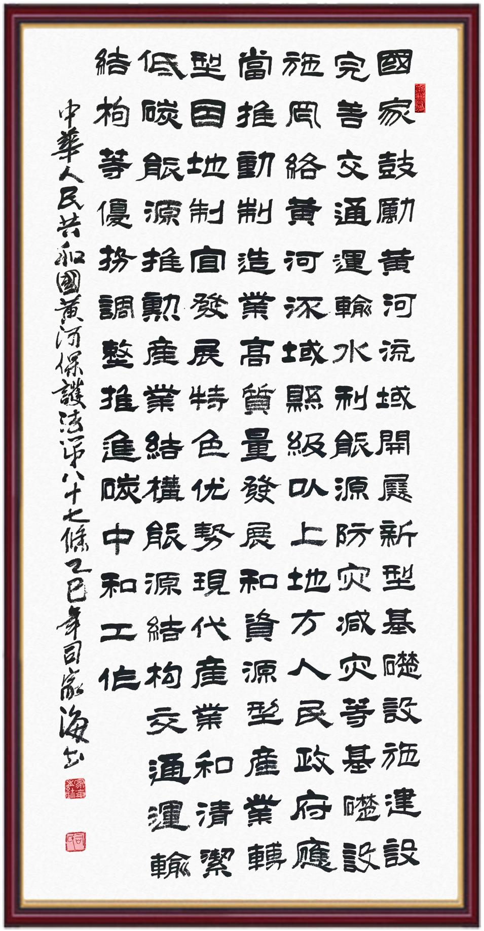 黃河寧,天下平。黃河是中華民族的發(fā)源地和搖籃,保護(hù)黃河是事關(guān)中華民族偉大復(fù)興的千秋大計(jì)。《中華人民共和國(guó)黃河保護(hù)法》為推進(jìn)水資源節(jié)約集約利用、保護(hù)傳承弘揚(yáng)黃河文化、推動(dòng)黃河流域生態(tài)保護(hù)和高質(zhì)量發(fā)展提供了有力法治保障。繼書寫《中華人民共和國(guó)民法典》《中華人民共和國(guó)憲法》《中華人民共和國(guó)澳門特別行政區(qū)基本法》《中華人民共和國(guó)香港特別行政區(qū)基本法》《中華人民共和國(guó)國(guó)旗法》《中華人民共和國(guó)國(guó)徽法》《中華人民共和國(guó)國(guó)歌法》《中華人民共和國(guó)法官法》等法律法規(guī)之后,法制日?qǐng)?bào)社聯(lián)合沿黃九?。▍^(qū))司法廳、書法家協(xié)會(huì),將筆端對(duì)準(zhǔn)《中華人民共和國(guó)黃河保護(hù)法》。