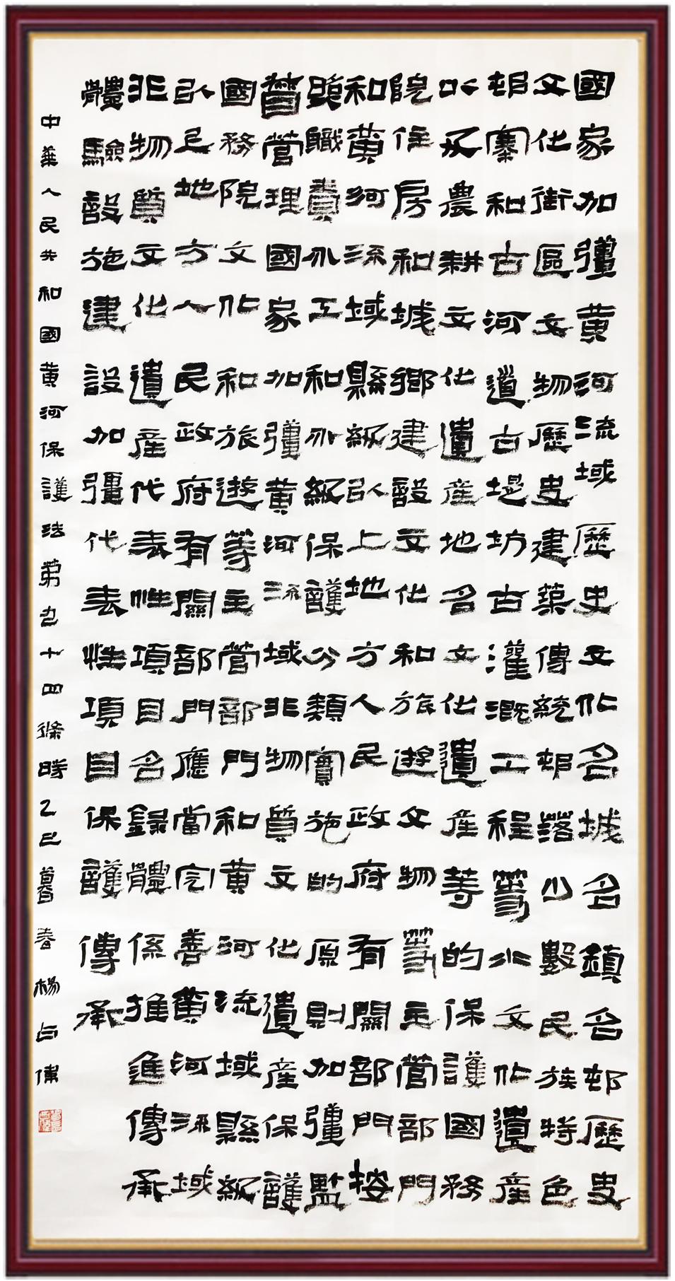 黃河寧,天下平。黃河是中華民族的發(fā)源地和搖籃,保護(hù)黃河是事關(guān)中華民族偉大復(fù)興的千秋大計?!吨腥A人民共和國黃河保護(hù)法》為推進(jìn)水資源節(jié)約集約利用、保護(hù)傳承弘揚(yáng)黃河文化、推動黃河流域生態(tài)保護(hù)和高質(zhì)量發(fā)展提供了有力法治保障。繼書寫《中華人民共和國民法典》《中華人民共和國憲法》《中華人民共和國澳門特別行政區(qū)基本法》《中華人民共和國香港特別行政區(qū)基本法》《中華人民共和國國旗法》《中華人民共和國國徽法》《中華人民共和國國歌法》《中華人民共和國法官法》等法律法規(guī)之后,法制日報社聯(lián)合沿黃九省(區(qū))司法廳、書法家協(xié)會,將筆端對準(zhǔn)《中華人民共和國黃河保護(hù)法》。