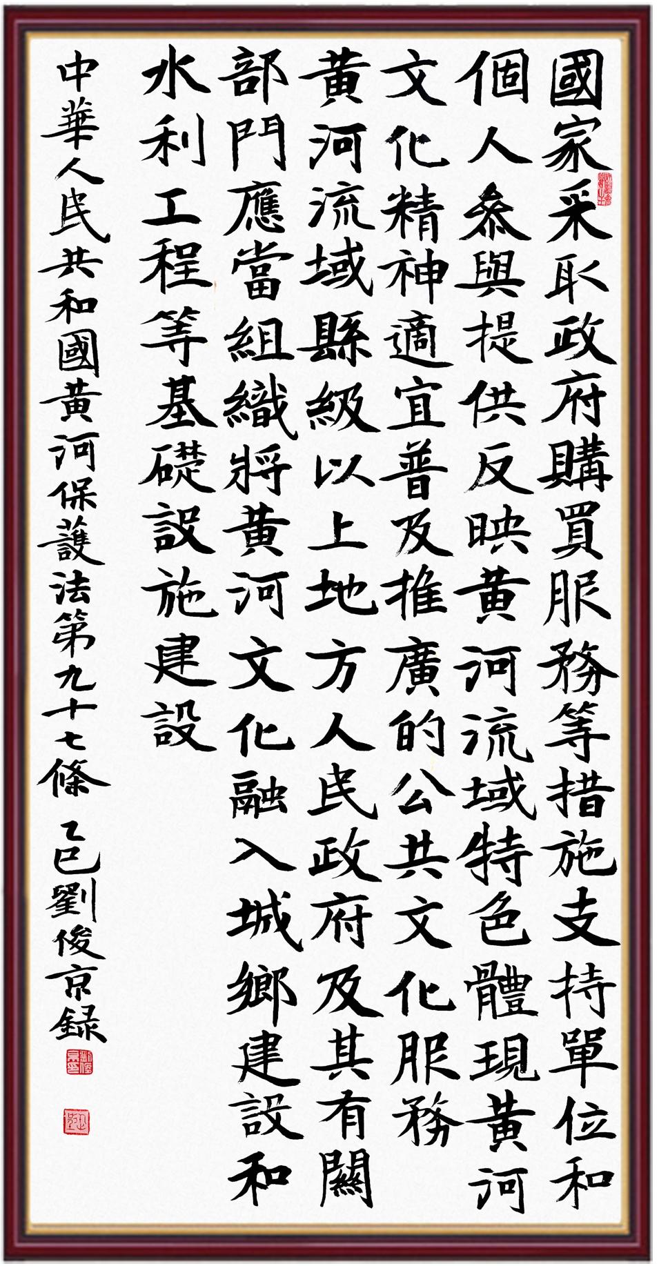 黃河寧,天下平。黃河是中華民族的發(fā)源地和搖籃,保護(hù)黃河是事關(guān)中華民族偉大復(fù)興的千秋大計(jì)?!吨腥A人民共和國黃河保護(hù)法》為推進(jìn)水資源節(jié)約集約利用、保護(hù)傳承弘揚(yáng)黃河文化、推動黃河流域生態(tài)保護(hù)和高質(zhì)量發(fā)展提供了有力法治保障。繼書寫《中華人民共和國民法典》《中華人民共和國憲法》《中華人民共和國澳門特別行政區(qū)基本法》《中華人民共和國香港特別行政區(qū)基本法》《中華人民共和國國旗法》《中華人民共和國國徽法》《中華人民共和國國歌法》《中華人民共和國法官法》等法律法規(guī)之后,法制日報(bào)社聯(lián)合沿黃九?。▍^(qū))司法廳、書法家協(xié)會,將筆端對準(zhǔn)《中華人民共和國黃河保護(hù)法》。