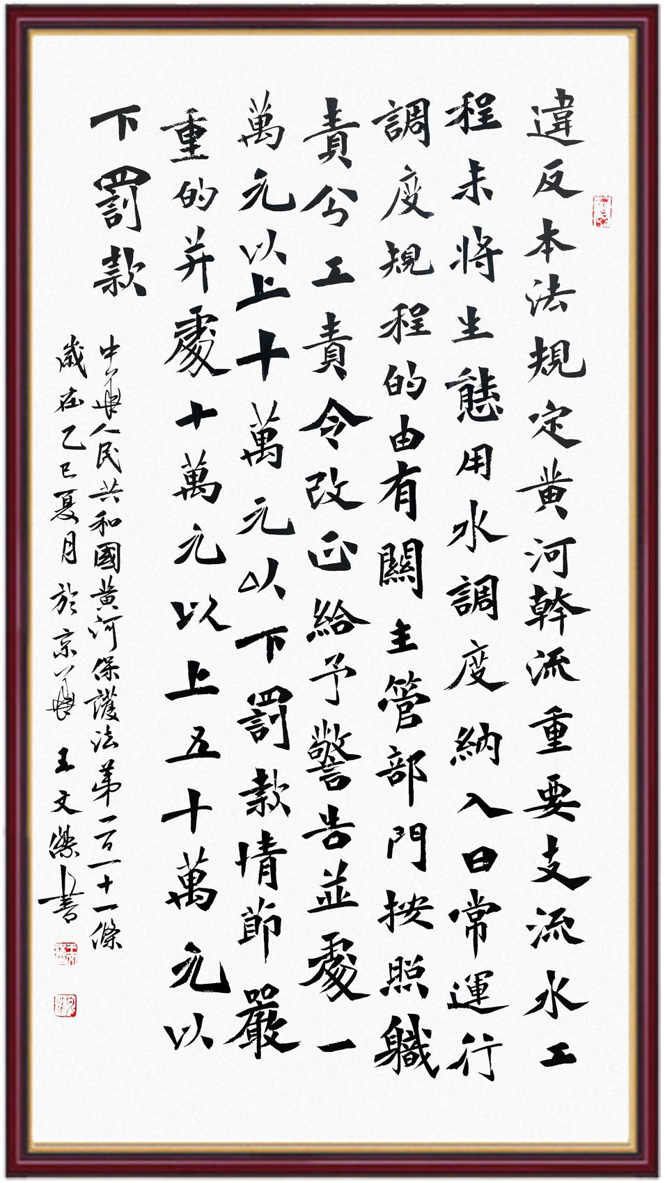黃河寧,天下平。黃河是中華民族的發(fā)源地和搖籃,保護(hù)黃河是事關(guān)中華民族偉大復(fù)興的千秋大計(jì)?!吨腥A人民共和國(guó)黃河保護(hù)法》為推進(jìn)水資源節(jié)約集約利用、保護(hù)傳承弘揚(yáng)黃河文化、推動(dòng)黃河流域生態(tài)保護(hù)和高質(zhì)量發(fā)展提供了有力法治保障。繼書(shū)寫(xiě)《中華人民共和國(guó)民法典》《中華人民共和國(guó)憲法》《中華人民共和國(guó)澳門(mén)特別行政區(qū)基本法》《中華人民共和國(guó)香港特別行政區(qū)基本法》《中華人民共和國(guó)國(guó)旗法》《中華人民共和國(guó)國(guó)徽法》《中華人民共和國(guó)國(guó)歌法》《中華人民共和國(guó)法官法》等法律法規(guī)之后,法制日?qǐng)?bào)社聯(lián)合沿黃九省(區(qū))司法廳、書(shū)法家協(xié)會(huì),將筆端對(duì)準(zhǔn)《中華人民共和國(guó)黃河保護(hù)法》。