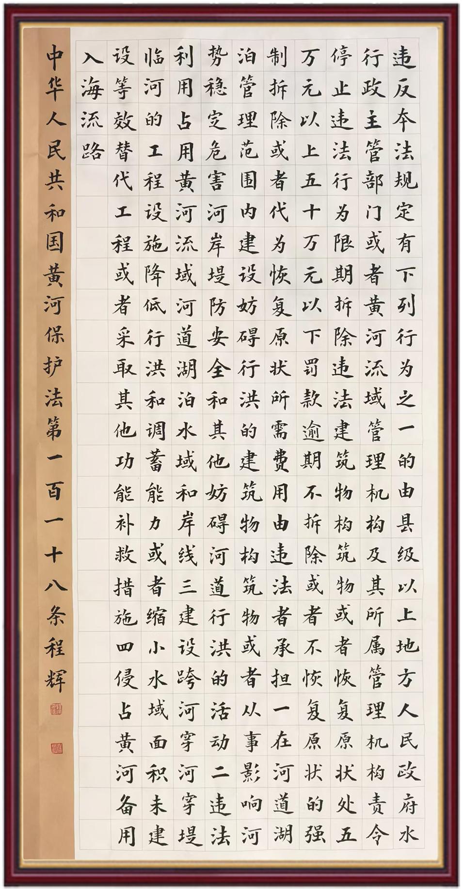 黃河寧,天下平。黃河是中華民族的發(fā)源地和搖籃,保護(hù)黃河是事關(guān)中華民族偉大復(fù)興的千秋大計(jì)?!吨腥A人民共和國(guó)黃河保護(hù)法》為推進(jìn)水資源節(jié)約集約利用、保護(hù)傳承弘揚(yáng)黃河文化、推動(dòng)黃河流域生態(tài)保護(hù)和高質(zhì)量發(fā)展提供了有力法治保障。繼書(shū)寫(xiě)《中華人民共和國(guó)民法典》《中華人民共和國(guó)憲法》《中華人民共和國(guó)澳門特別行政區(qū)基本法》《中華人民共和國(guó)香港特別行政區(qū)基本法》《中華人民共和國(guó)國(guó)旗法》《中華人民共和國(guó)國(guó)徽法》《中華人民共和國(guó)國(guó)歌法》《中華人民共和國(guó)法官法》等法律法規(guī)之后,法制日?qǐng)?bào)社聯(lián)合沿黃九省(區(qū))司法廳、書(shū)法家協(xié)會(huì),將筆端對(duì)準(zhǔn)《中華人民共和國(guó)黃河保護(hù)法》。