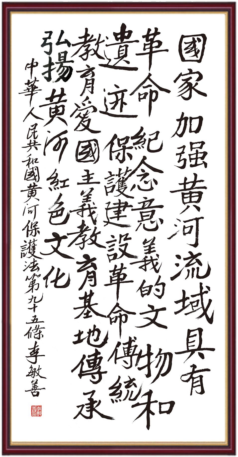 黃河寧,天下平。黃河是中華民族的發(fā)源地和搖籃,保護(hù)黃河是事關(guān)中華民族偉大復(fù)興的千秋大計(jì)。《中華人民共和國(guó)黃河保護(hù)法》為推進(jìn)水資源節(jié)約集約利用、保護(hù)傳承弘揚(yáng)黃河文化、推動(dòng)黃河流域生態(tài)保護(hù)和高質(zhì)量發(fā)展提供了有力法治保障。繼書(shū)寫(xiě)《中華人民共和國(guó)民法典》《中華人民共和國(guó)憲法》《中華人民共和國(guó)澳門(mén)特別行政區(qū)基本法》《中華人民共和國(guó)香港特別行政區(qū)基本法》《中華人民共和國(guó)國(guó)旗法》《中華人民共和國(guó)國(guó)徽法》《中華人民共和國(guó)國(guó)歌法》《中華人民共和國(guó)法官法》等法律法規(guī)之后,法制日?qǐng)?bào)社聯(lián)合沿黃九?。▍^(qū))司法廳、書(shū)法家協(xié)會(huì),將筆端對(duì)準(zhǔn)《中華人民共和國(guó)黃河保護(hù)法》。