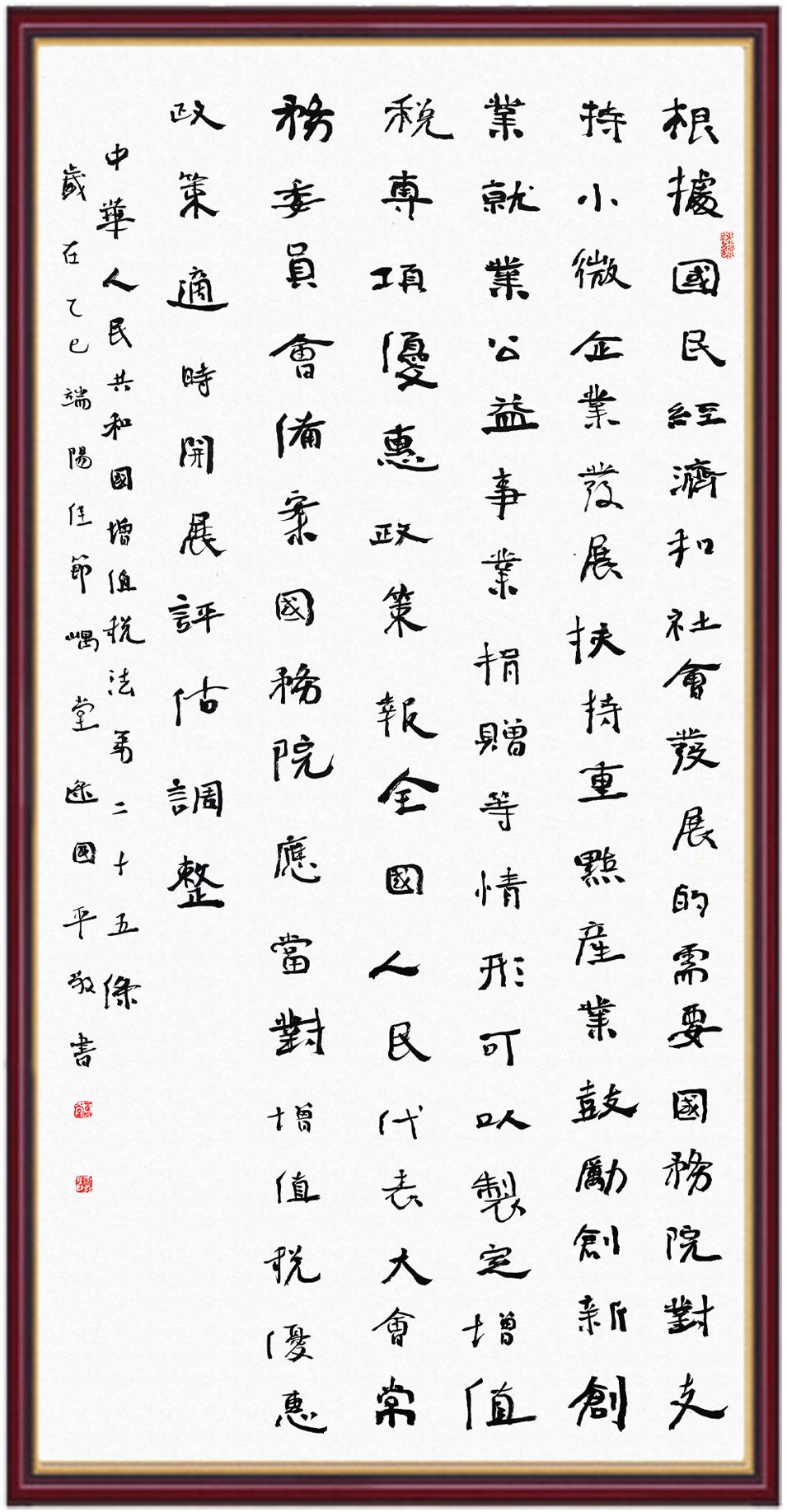 稅收一頭連著國(guó)計(jì),一頭連著民生。全面推進(jìn)依法治稅,是全面依法治國(guó)基本方略在稅收領(lǐng)域的集中體現(xiàn)?!吨腥A人民共和國(guó)增值稅法》將于2026年1月1日起施行,對(duì)全面落實(shí)稅收法定原則、健全有利于高質(zhì)量發(fā)展的增值稅制度、規(guī)范增值稅的征收和繳納、保護(hù)納稅人合法權(quán)益具有重要意義。繼書(shū)寫(xiě)《中華人民共和國(guó)民法典》《中華人民共和國(guó)憲法》《中華人民共和國(guó)國(guó)旗法》《中華人民共和國(guó)國(guó)徽法》《中華人民共和國(guó)國(guó)歌法》《中華人民共和國(guó)法官法》《中華人民共和國(guó)黃河保護(hù)法》等法律法規(guī)之后,法制日?qǐng)?bào)社將筆端對(duì)準(zhǔn)《中華人民共和國(guó)增值稅法》。