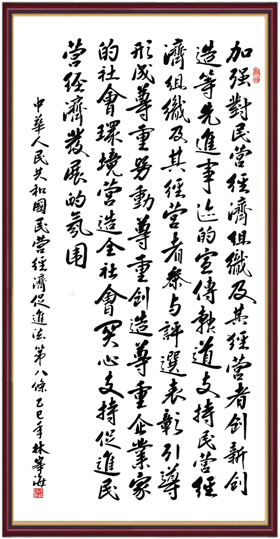 《中華人民共和國(guó)民營(yíng)經(jīng)濟(jì)促進(jìn)法》自今年5月20日起施行。作為我國(guó)首部專門關(guān)于民營(yíng)經(jīng)濟(jì)發(fā)展的基礎(chǔ)性法律,民營(yíng)經(jīng)濟(jì)促進(jìn)法將支持和保障民營(yíng)經(jīng)濟(jì)發(fā)展的法律制度融入中國(guó)特色社會(huì)主義法律體系,具有重大的法治意義,為促進(jìn)民營(yíng)經(jīng)濟(jì)持續(xù)、健康、高質(zhì)量發(fā)展提供了堅(jiān)實(shí)的法治保障。為更好地學(xué)習(xí)、宣傳、貫徹這部法律,法治日?qǐng)?bào)社聯(lián)合司法部普法與依法治理局,開展“‘書·法’系列活動(dòng)之書寫《中華人民共和國(guó)民營(yíng)經(jīng)濟(jì)促進(jìn)法》”活動(dòng)。