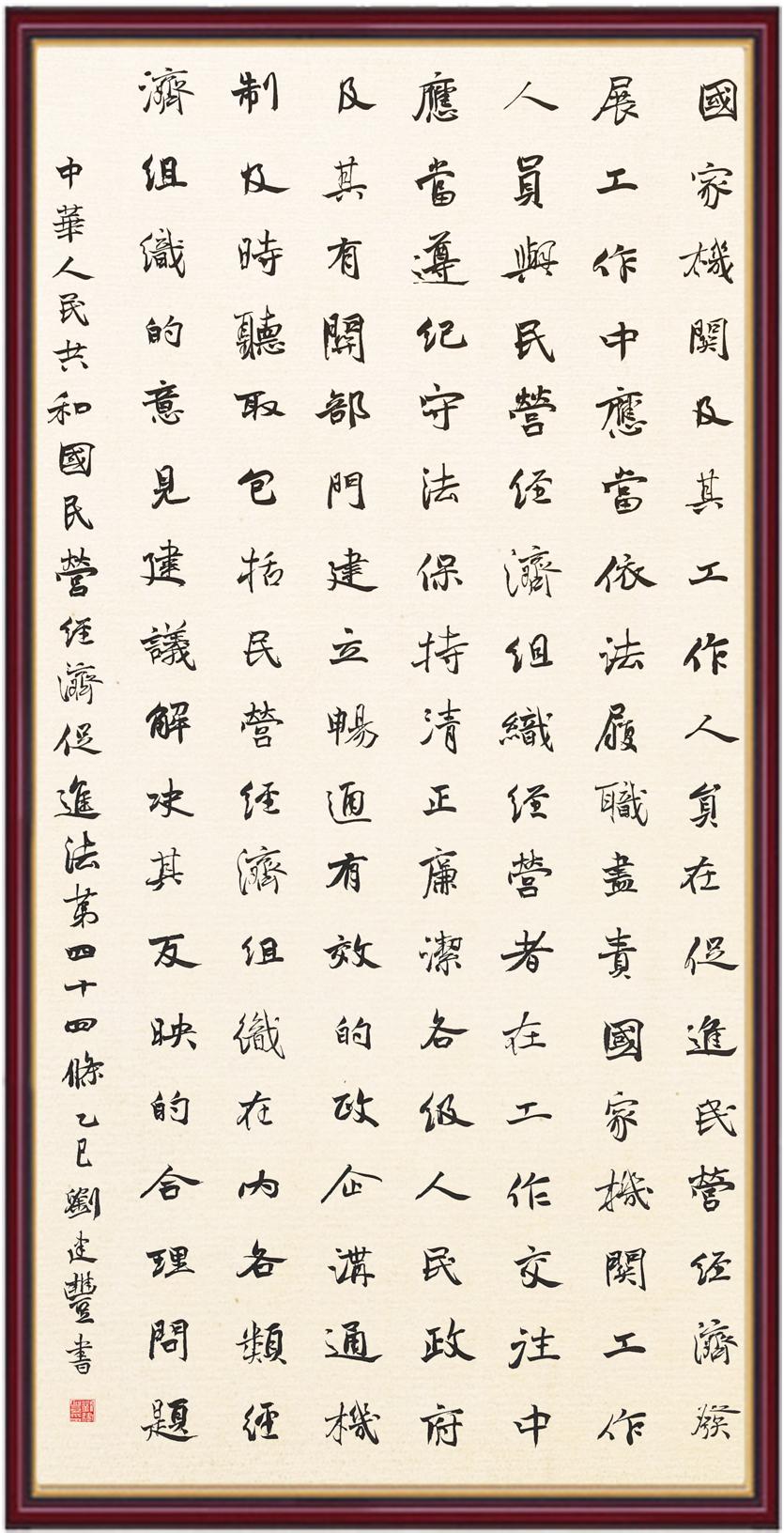 《中華人民共和國(guó)民營(yíng)經(jīng)濟(jì)促進(jìn)法》自今年5月20日起施行。作為我國(guó)首部專門關(guān)于民營(yíng)經(jīng)濟(jì)發(fā)展的基礎(chǔ)性法律,民營(yíng)經(jīng)濟(jì)促進(jìn)法將支持和保障民營(yíng)經(jīng)濟(jì)發(fā)展的法律制度融入中國(guó)特色社會(huì)主義法律體系,具有重大的法治意義,為促進(jìn)民營(yíng)經(jīng)濟(jì)持續(xù)、健康、高質(zhì)量發(fā)展提供了堅(jiān)實(shí)的法治保障。為更好地學(xué)習(xí)、宣傳、貫徹這部法律,法治日?qǐng)?bào)社聯(lián)合司法部普法與依法治理局,開展“‘書·法’系列活動(dòng)之書寫《中華人民共和國(guó)民營(yíng)經(jīng)濟(jì)促進(jìn)法》”活動(dòng)。