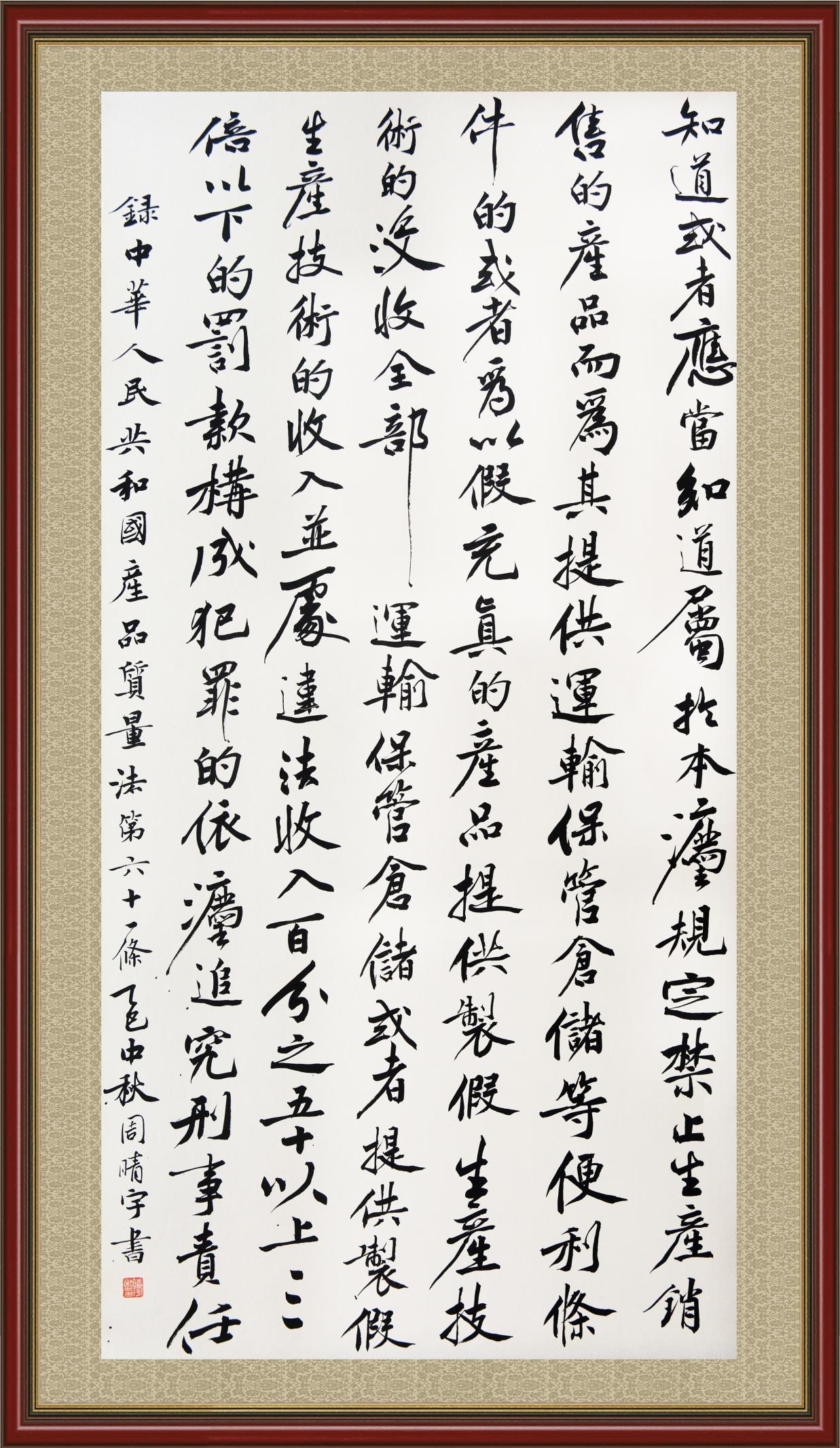 《中華人民共和國(guó)產(chǎn)品質(zhì)量法》自1993年9月1日起開始施行,先后進(jìn)行三次修正。作為產(chǎn)品質(zhì)量領(lǐng)域的基本法律,產(chǎn)品質(zhì)量法對(duì)規(guī)范產(chǎn)品質(zhì)量管理、維護(hù)消費(fèi)者合法權(quán)益、促進(jìn)經(jīng)濟(jì)社會(huì)發(fā)展具有重要意義。為更好地學(xué)習(xí)、宣傳、貫徹這部法律,在國(guó)家市場(chǎng)監(jiān)督管理總局法規(guī)司的支持下,法治日?qǐng)?bào)社開展了“‘書·法’系列活動(dòng)之書寫《中華人民共和國(guó)產(chǎn)品質(zhì)量法》”活動(dòng)。