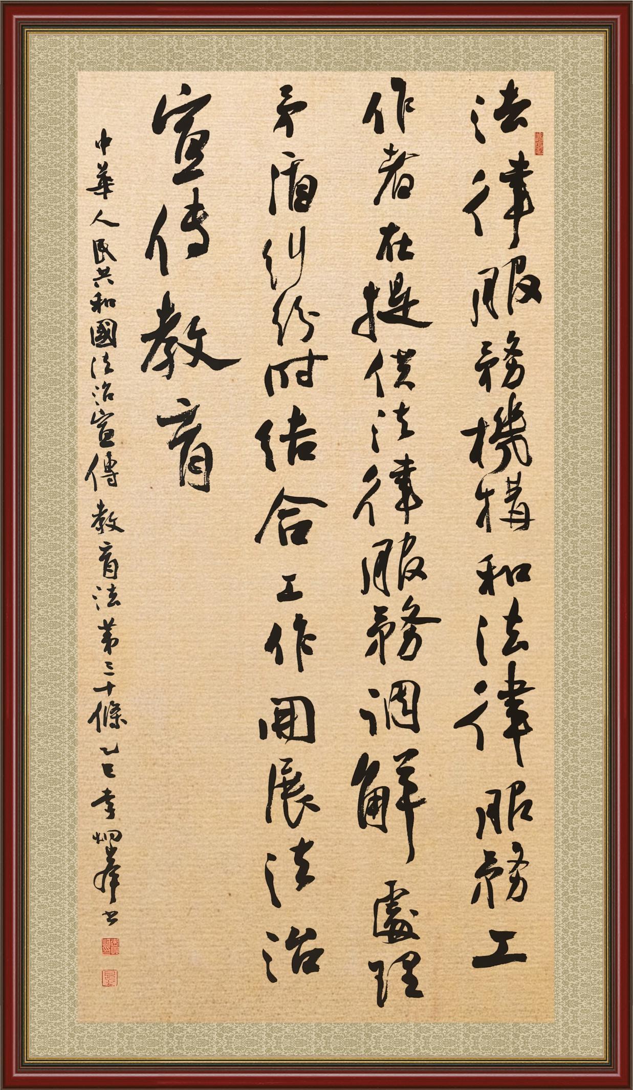 2020年7月11日,由法治日?qǐng)?bào)社主辦的“書·法”系列活動(dòng)正式啟動(dòng),先后書寫《中華人民共和國民法典》《中華人民共和國憲法》《中華人民共和國民營經(jīng)濟(jì)促進(jìn)法》等21部法律法規(guī)。