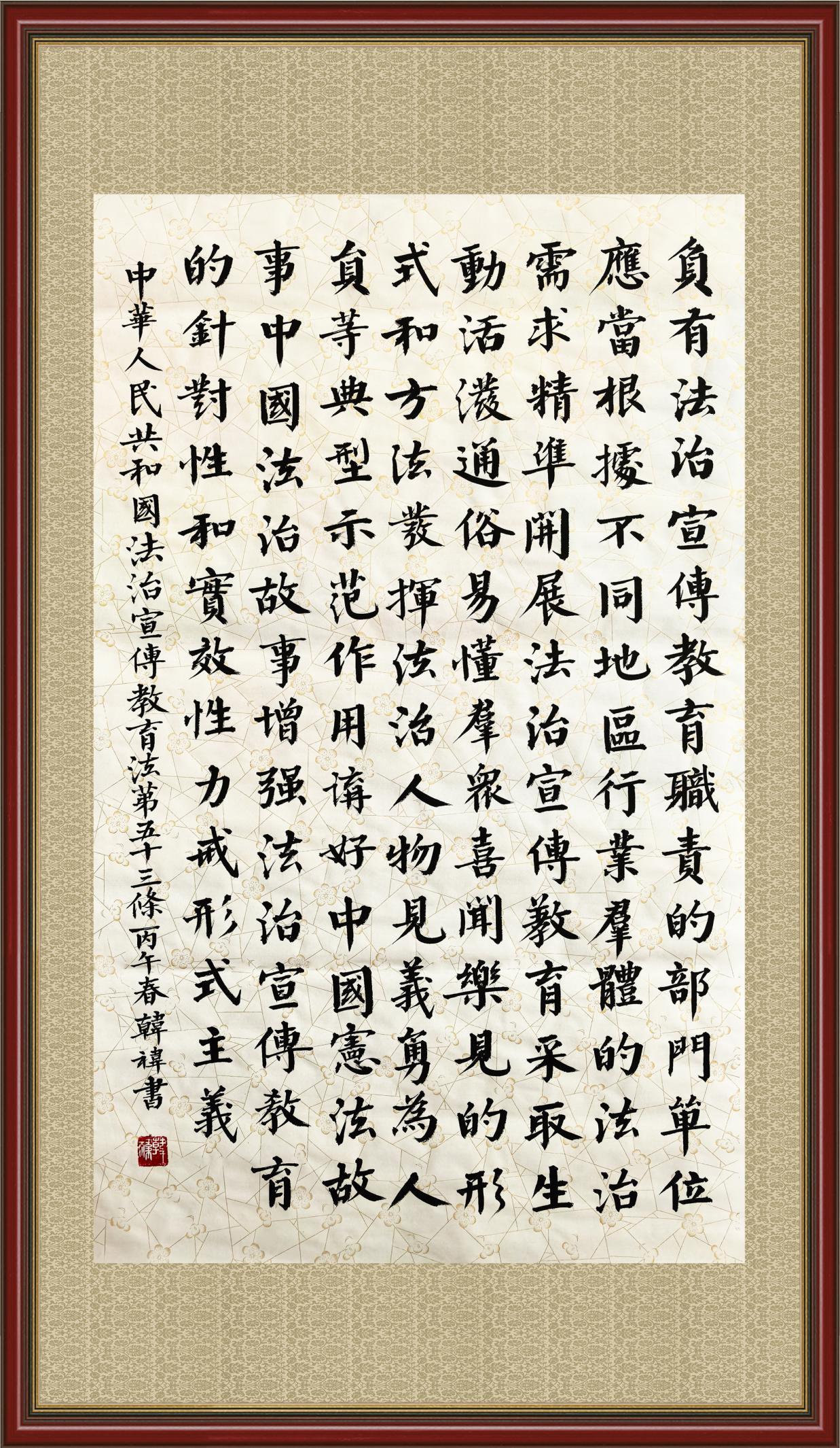 《中華人民共和國法治宣傳教育法》自2025年11月1日起開始施行。法治宣傳教育是全面依法治國的長期基礎(chǔ)性工作。法治宣傳教育法對提升全民法治素養(yǎng)和社會治理法治化水平、推動建設(shè)更高水平的社會主義法治國家具有重要意義。為更好地學(xué)習(xí)、宣傳、貫徹這部法律,法治日報(bào)社聯(lián)合司法部普法與依法治理局,開展了“‘書·法’系列活動之書寫《中華人民共和國法治宣傳教育法》”活動。