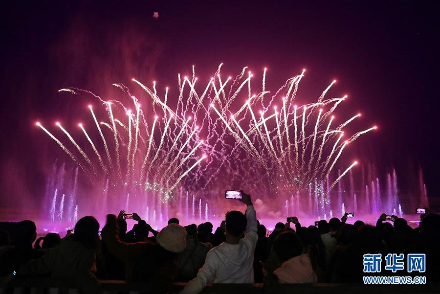 1月31日晚,游客們?cè)谔旌犹毒皡^(qū)欣賞煙花光影水秀。新華網(wǎng) 盧志佳 攝