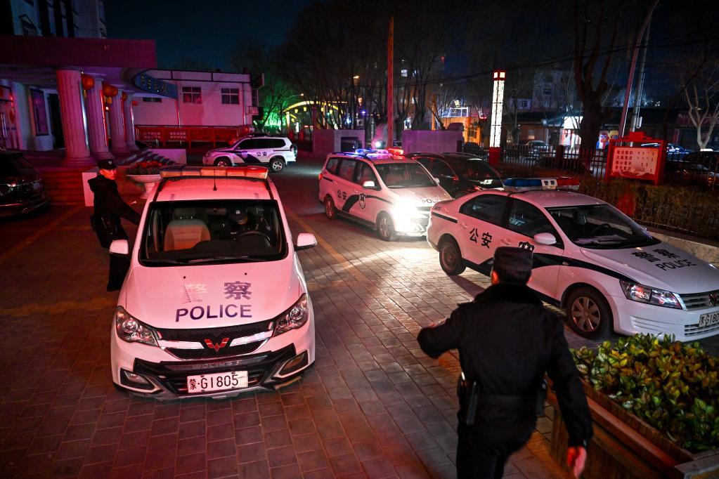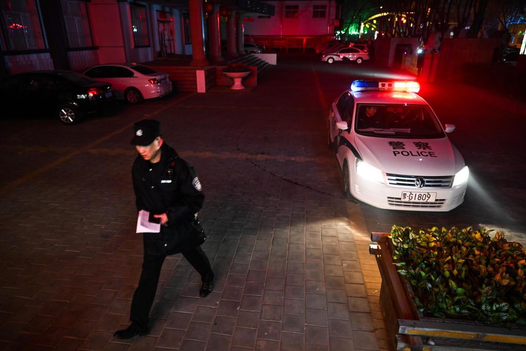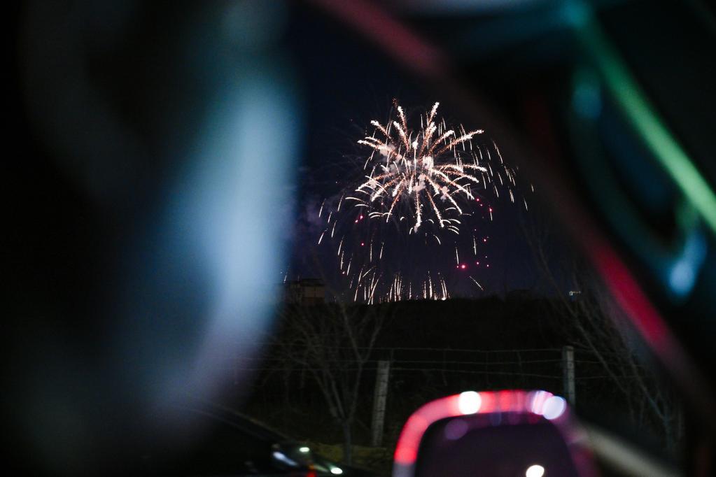 2月5日,通遼市奈曼旗公安局大沁他拉派出所民警在出警時(shí),遠(yuǎn)處綻放的煙花。