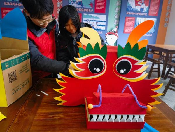 活動(dòng)中,孩子們在志愿者們的指導(dǎo)下通過描、畫、剪、貼的方式,把一個(gè)個(gè)普普通通的紙箱制作成了特有的“龍身,”這些普通的紙箱上都顯示出孩子們天馬行空的想象力。然后再將這些制作好的龍身與龍頭組合在一起,便成了獨(dú)一無二的紙箱龍燈。