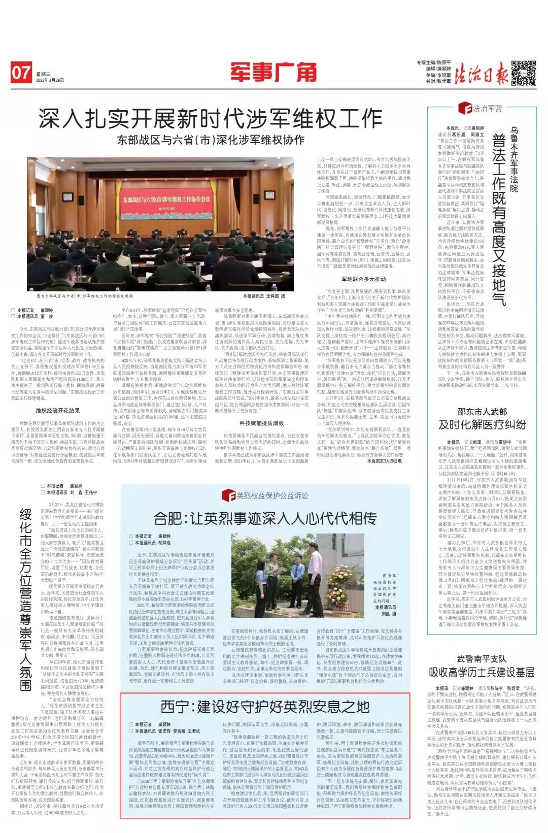 兩年來,西寧軍事檢察院還多次協(xié)調(diào)組織駐地部隊(duì)官兵開展“護(hù)英烈鑄忠誠”等主題黨日活動(dòng),官兵定期輪流幫助陵園管護(hù)人員清除雜草、修繕紀(jì)念設(shè)施。該院辦理的兩起行政公益訴訟案件入選為全國紅色資源保護(hù)典型案例,3縣烈士陵園也成為當(dāng)?shù)刂攸c(diǎn)紅色教育基地。
