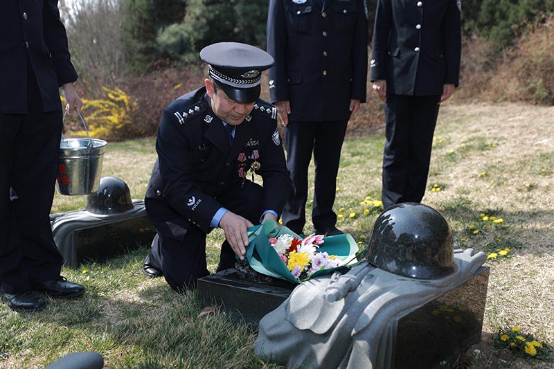 圖為公安民警代表擦拭墓碑,敬獻(xiàn)鮮花,表達(dá)對(duì)烈士的哀思。
