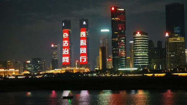 法治之光照亮美好生活。夜晚的南昌,一場大型燈光秀上演,在贛江兩岸標(biāo)志性建筑戶外LED大屏幕墻上,滾動播放著網(wǎng)絡(luò)文明、網(wǎng)絡(luò)法治等主題宣傳標(biāo)語、動圖、微視頻等,“e法治網(wǎng) 同心同行”的宣傳標(biāo)語,更是吸引了眾多市民駐足觀看。