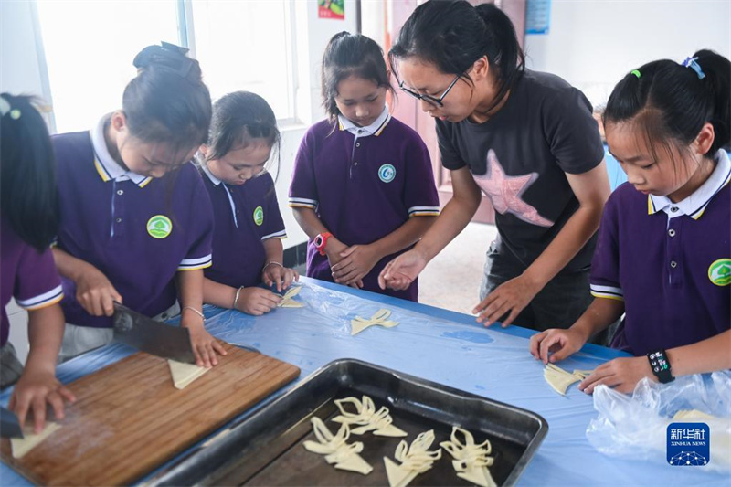 6月8日,學(xué)生們在傳統(tǒng)習(xí)俗課上學(xué)習(xí)做當(dāng)?shù)靥厣朗场溁ā?/span>