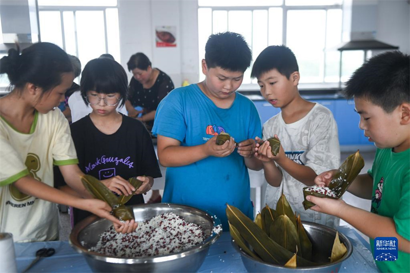 6月8日,學(xué)生們在傳統(tǒng)習(xí)俗課上學(xué)習(xí)包粽子。