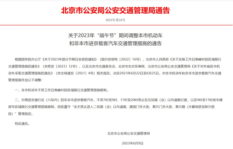 中新網(wǎng)6月14日電據(jù)北京市公安局公安交通管理局網(wǎng)站消息,北京市公安局公安交通管理局近日發(fā)布通告稱,根據(jù)國(guó)務(wù)院辦公廳《關(guān)于2023年部分節(jié)假日安排的通知》(國(guó)辦發(fā)明電〔2022〕16號(hào))、北京市人民政府《關(guān)于實(shí)施工作日高峰時(shí)段區(qū)域限行交通管理措施的通告》(京政發(fā)〔2023〕12號(hào)),以及北京市交通委員會(huì)、北京市生態(tài)環(huán)境局、北京市公安局公安交通管理局《關(guān)于對(duì)外省區(qū)市機(jī)動(dòng)車(chē)采取交通管理措施的通告》(京交綠通發(fā)〔2021〕4號(hào))相關(guān)規(guī)定,決定2023年6月22日至6月25日,對(duì)本市機(jī)動(dòng)車(chē)和非本市進(jìn)京載客汽車(chē)交通管理措施作出以下調(diào)整: